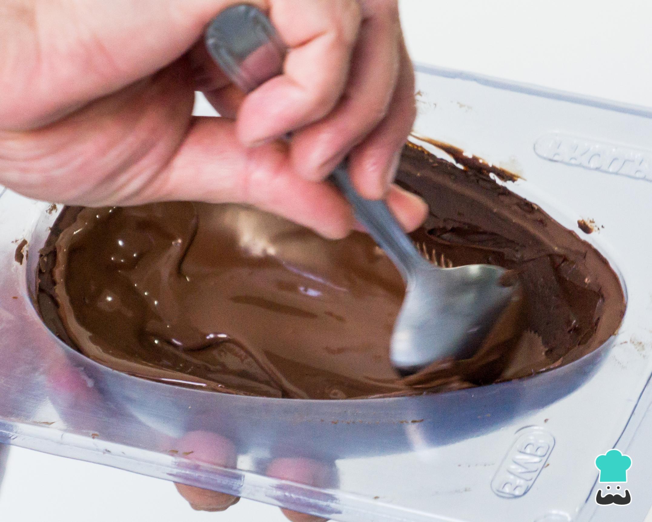 Com a ajuda de um pincel ou colher, passe uma camada fina de chocolate na forma de ovo de Páscoa. Reserve no congelador por 10-15 minutos, depois retire e passe mais uma camada de chocolate. Leve para gelar novamente.