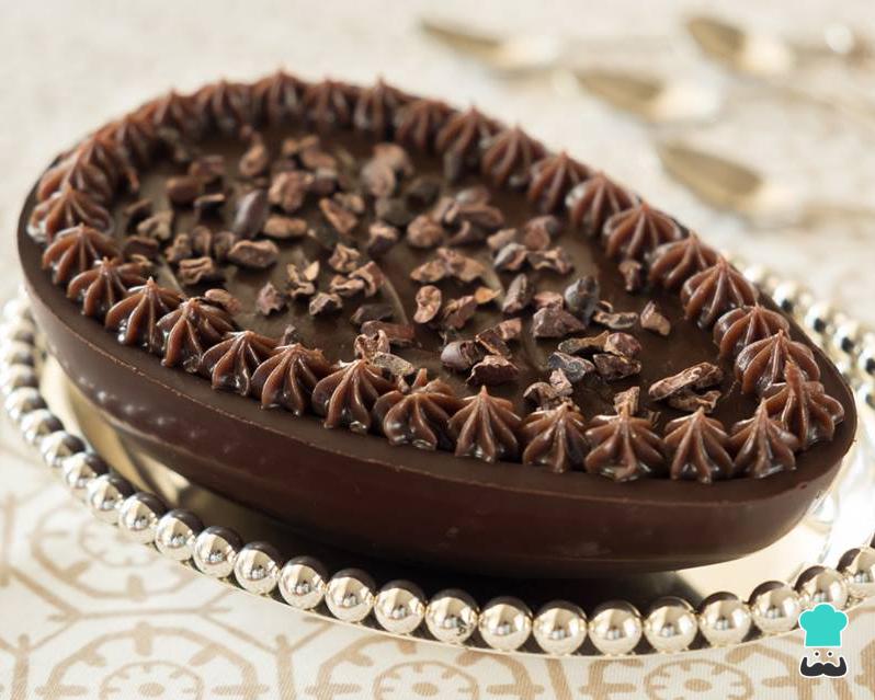 Dica: Para a decoração deste ovinho foram usados nibs de cacau e o creme do recheio.
