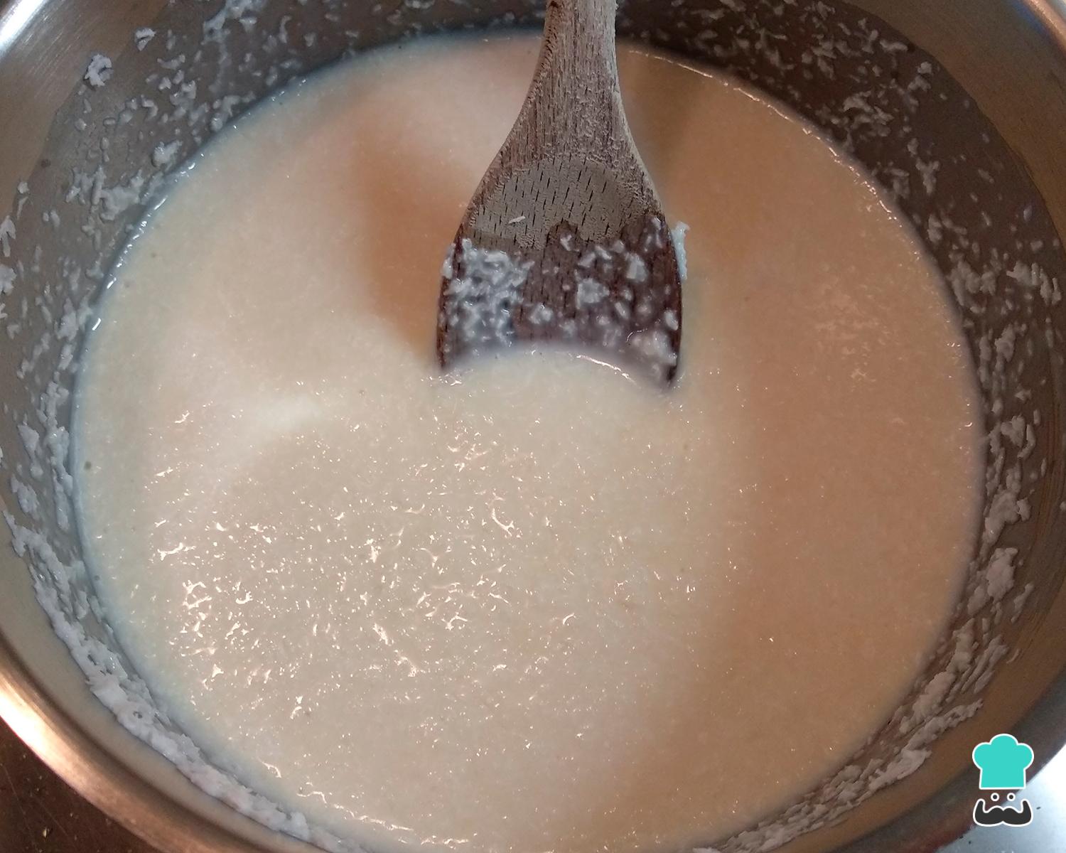 Para preparar esta sobremesa de Páscoa comece por dissolver a maisena no leite e colocar numa panela junto com o leite condensado, o creme de leite e o coco. Misture tudo.