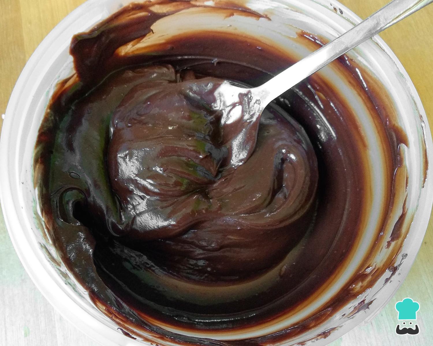 Enquanto isso pique o chocolate e leve a derreter em banho-maria no fogão ou no microondas. Adicione o creme de leite e misture muito bem até obter uma ganache suave, como na imagem. Reserve até esfriar.