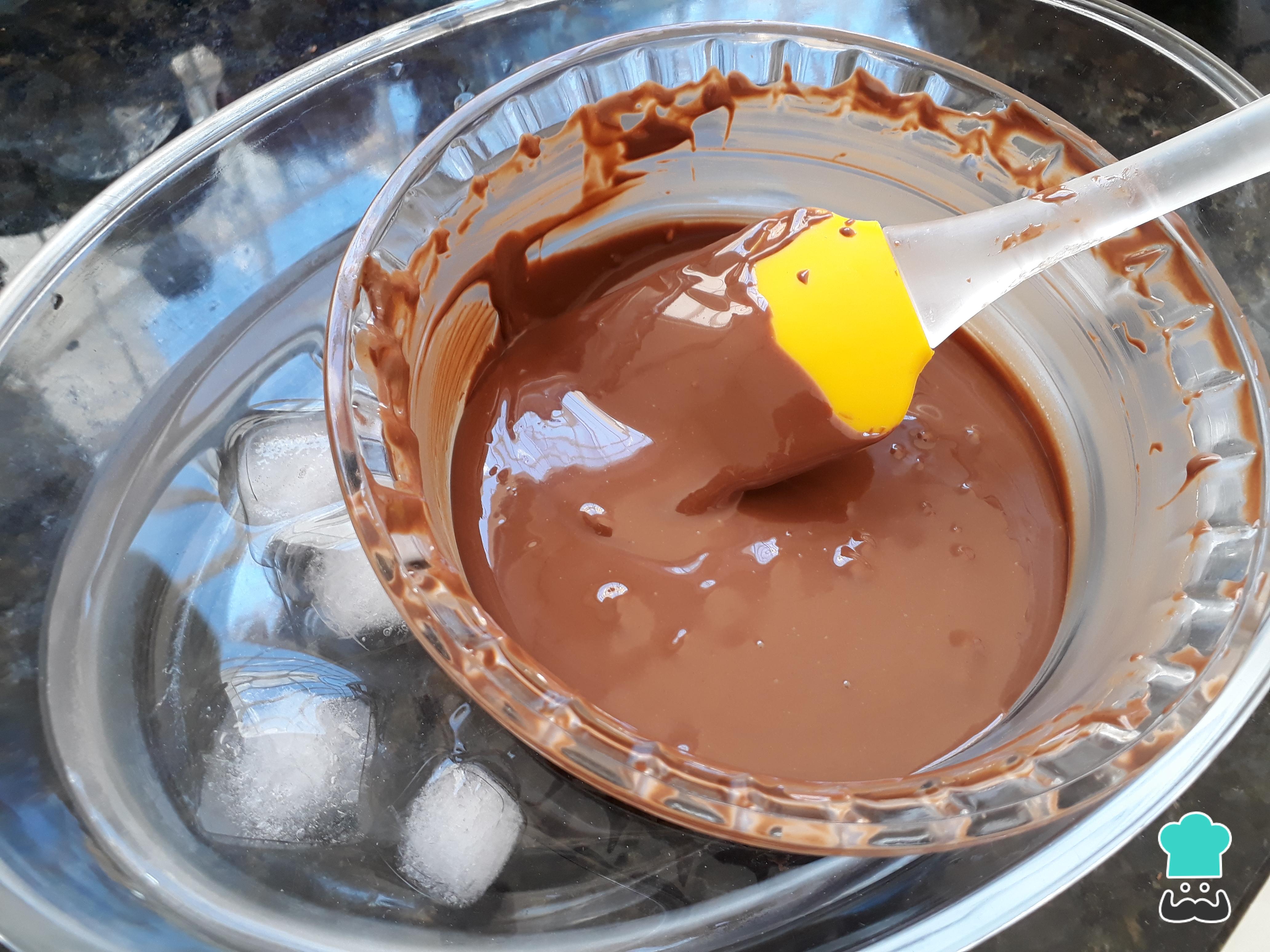 Derreta de 30 em 30 segundos em potência máxima no microondas, até atingir a temperatura de 40ºC. Depois transfira a vasilha com o chocolate para o banho-maria invertido, ou seja, na água fria com cubos de gelo. Mexa sem parar até que o chocolate chegue na temperatura de 24ºC.