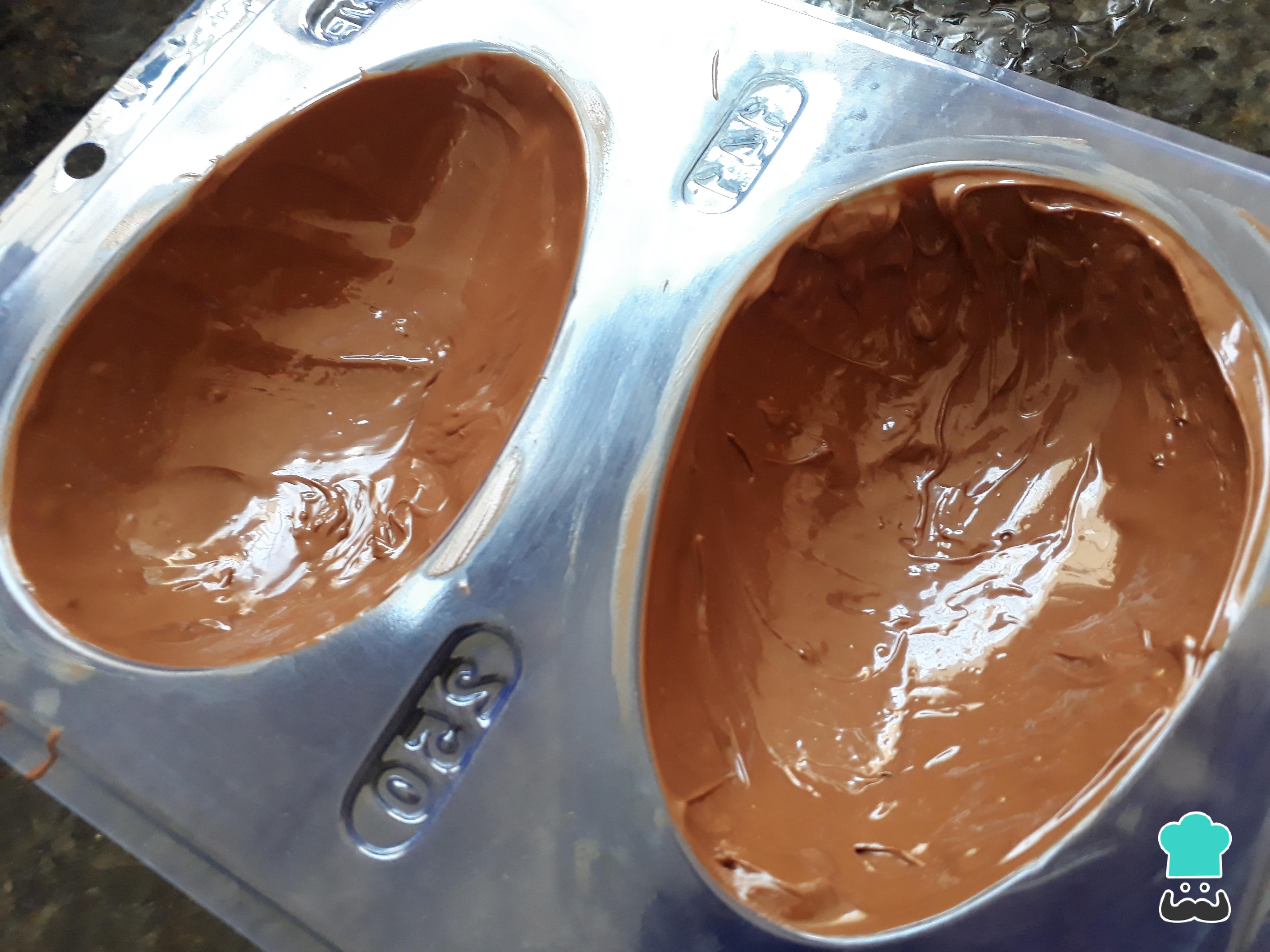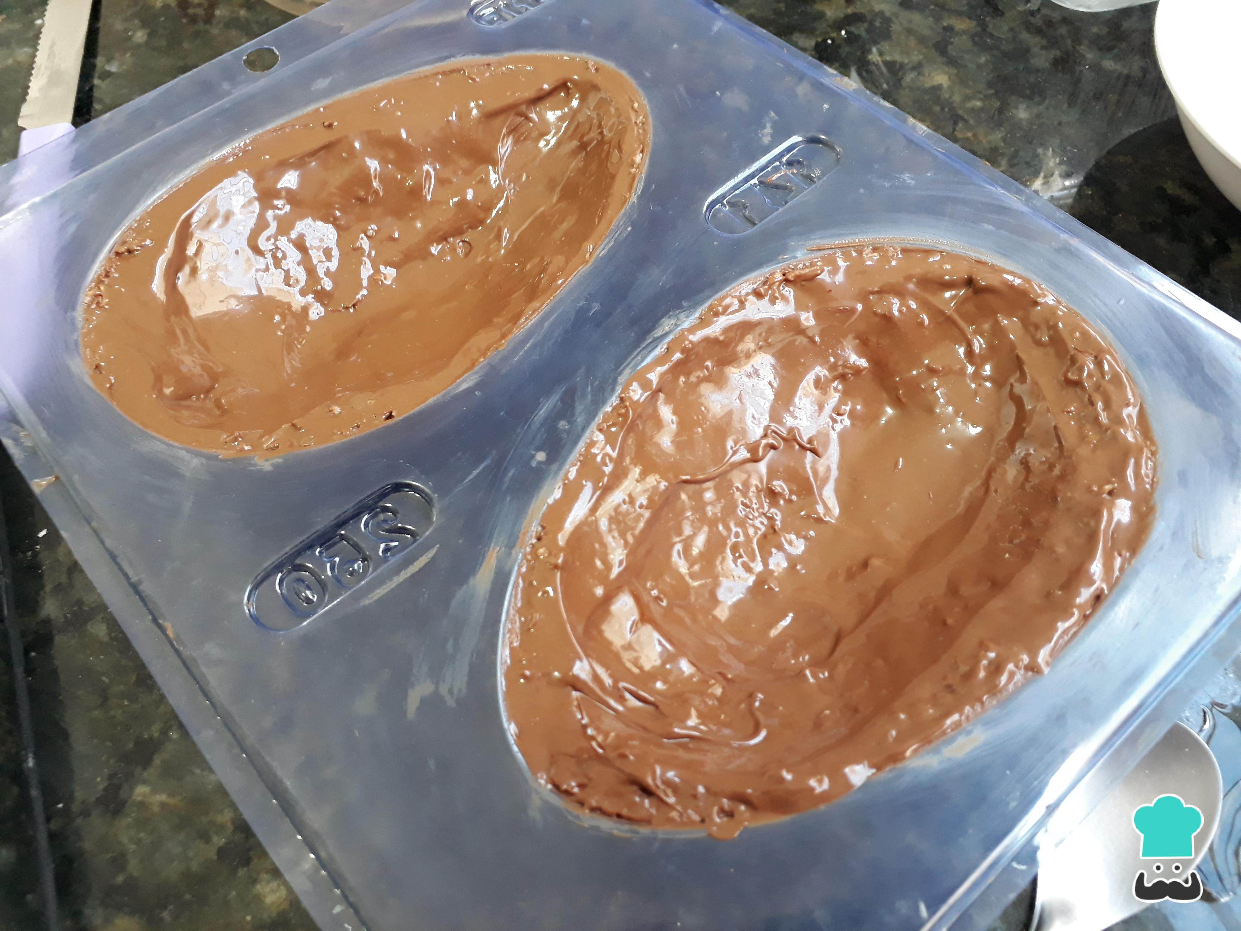 Depois que a temperagem foi feita no chocolate ao leite nobre, passe-o pela forma de ovo de Páscoa com o auxílio de uma espátula ou pincel de silicone.