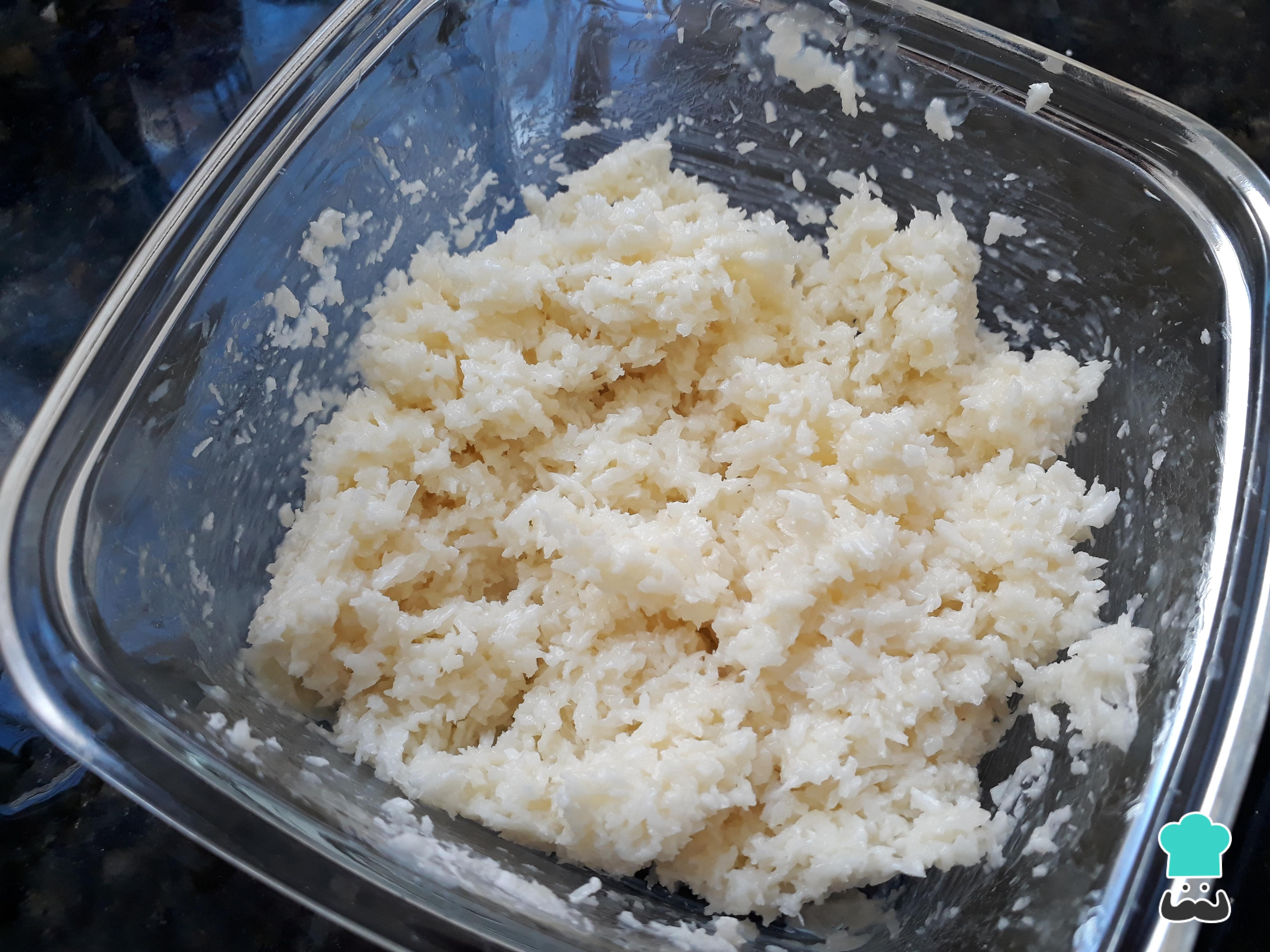 Para o recheio prestígio, basta misturar o coco ralado com o leite condensado até virar uma espécie de "farofinha". O ponto deve ser firme, não pode ficar muito mole. Para não perder o ponto, coloque de uma em uma colher de sopa de leite condensado e vá mexendo até ficar como mostra a foto.