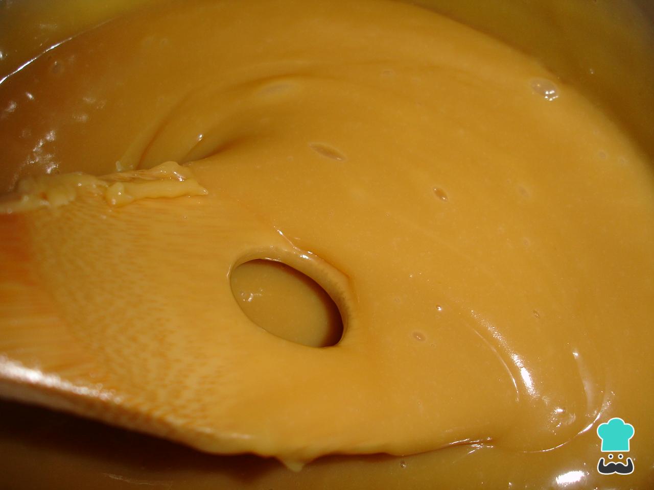 Para fazer este ovo de Páscoa, comece por preparar o doce de leite sem lactose. Para isso coloque todos os ingredientes respetivos em uma panela, leve ao fogo médio-baixo e fique mexendo até virar um creme espesso, com consistência semelhante ao doce de leite.