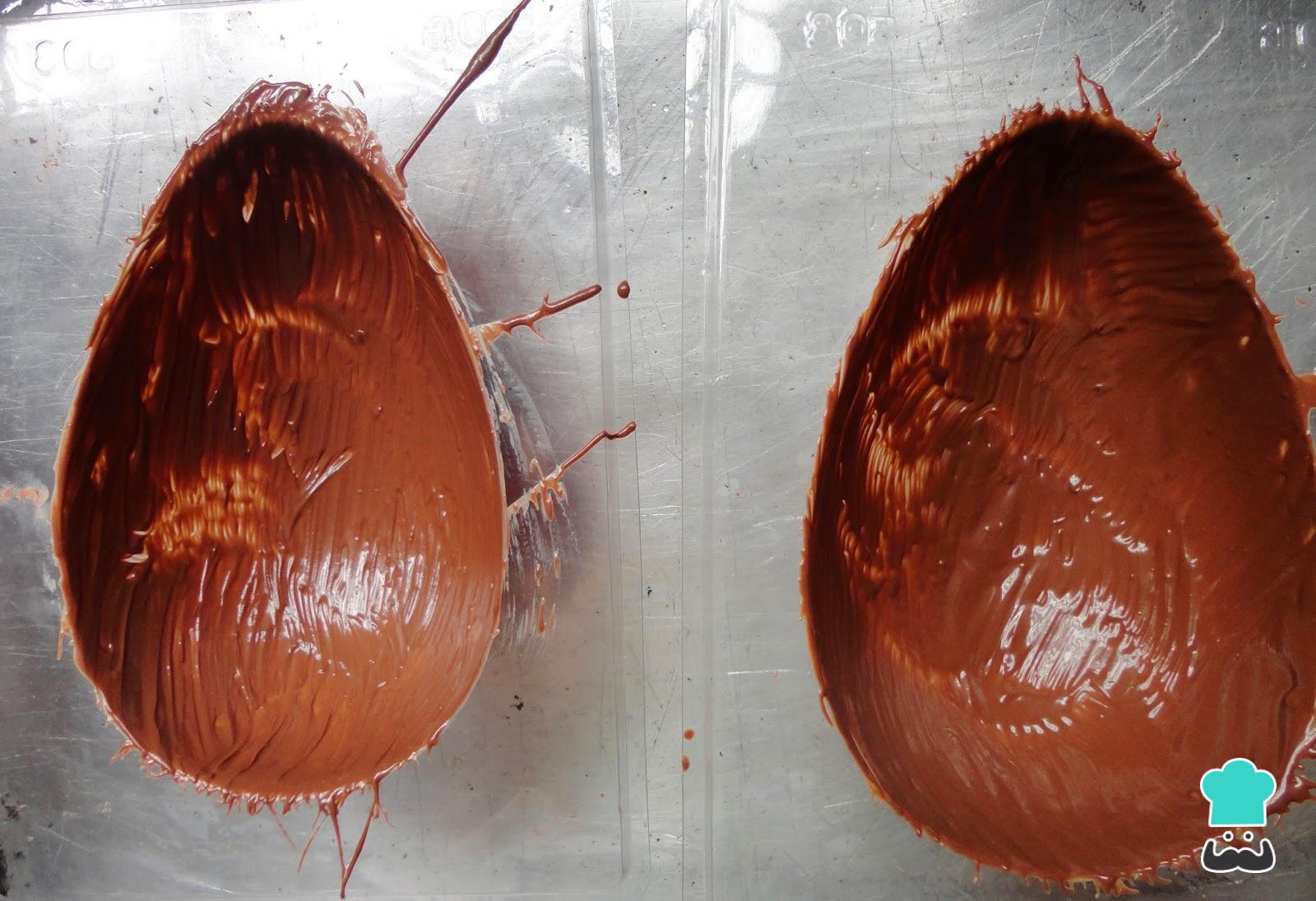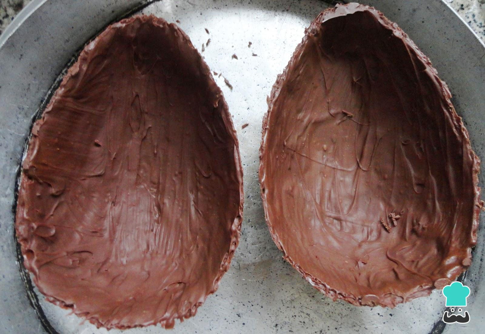 Assim que o chocolate estiver completamente derretido, coloque um pouco na forma do ovo de chocolate e espalhe com uma espátula, colher ou pincel. Reserve na geladeira por 30 minutos.