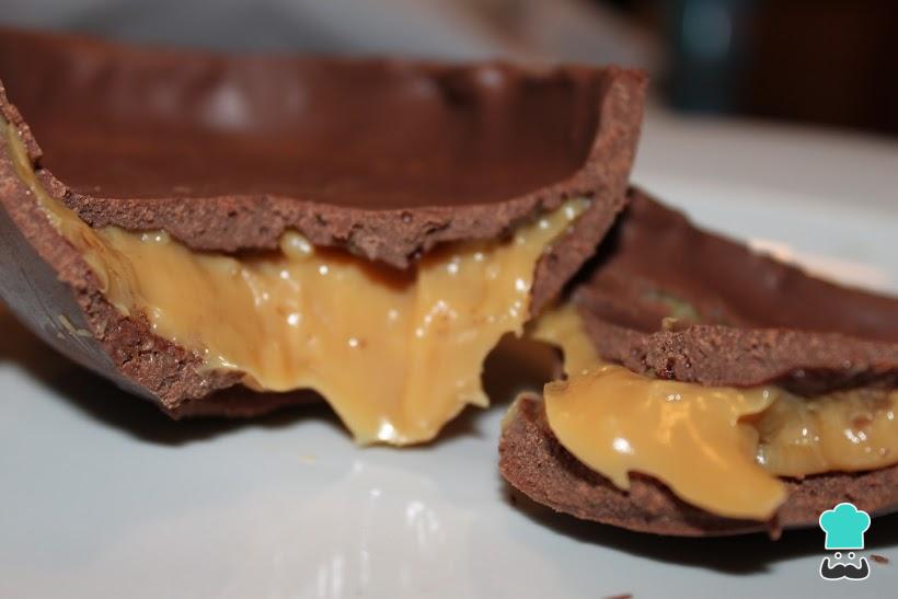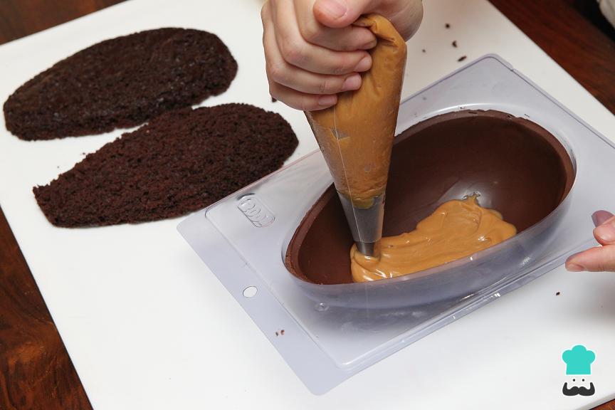 Quando o ovo de chocolate estiver pronto e o doce de leite frio, use um saco de confeiteiro para rechear o ovo. Adicione a quantidade de recheio que preferir, e espalhe sobre ele o chocolate restante.