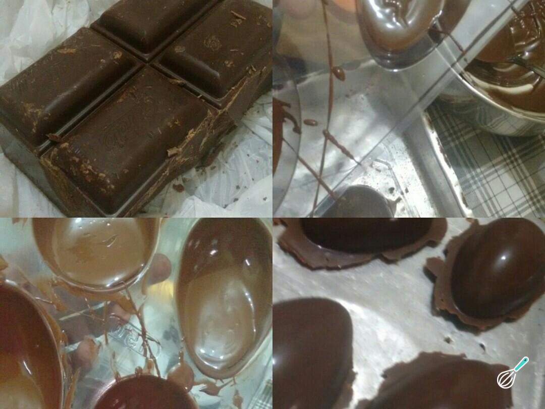 Parta o chocolate, derreta em banho-maria e unte as forminhas de ovo com ele. Vire ao contrário para escorrer o excesso de chocolate e leve ao freezer até endurecer. Repita o processo para conseguir uma casquinha de chocolate mais grossa.