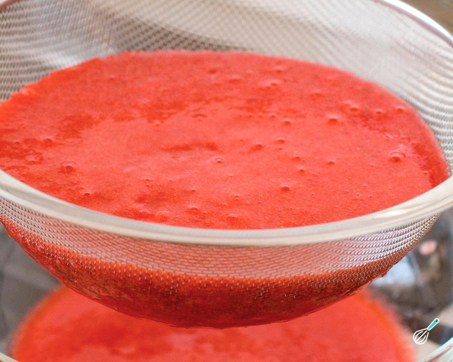 Prepare o ovo de Páscoa trufado de morango começando por preparar o recheio. Para isso lave os morangos, retire os topos e bata no liquidificador até obter um suco de morango. Peneire, para eliminar as sementes, e coloque numa panela.
