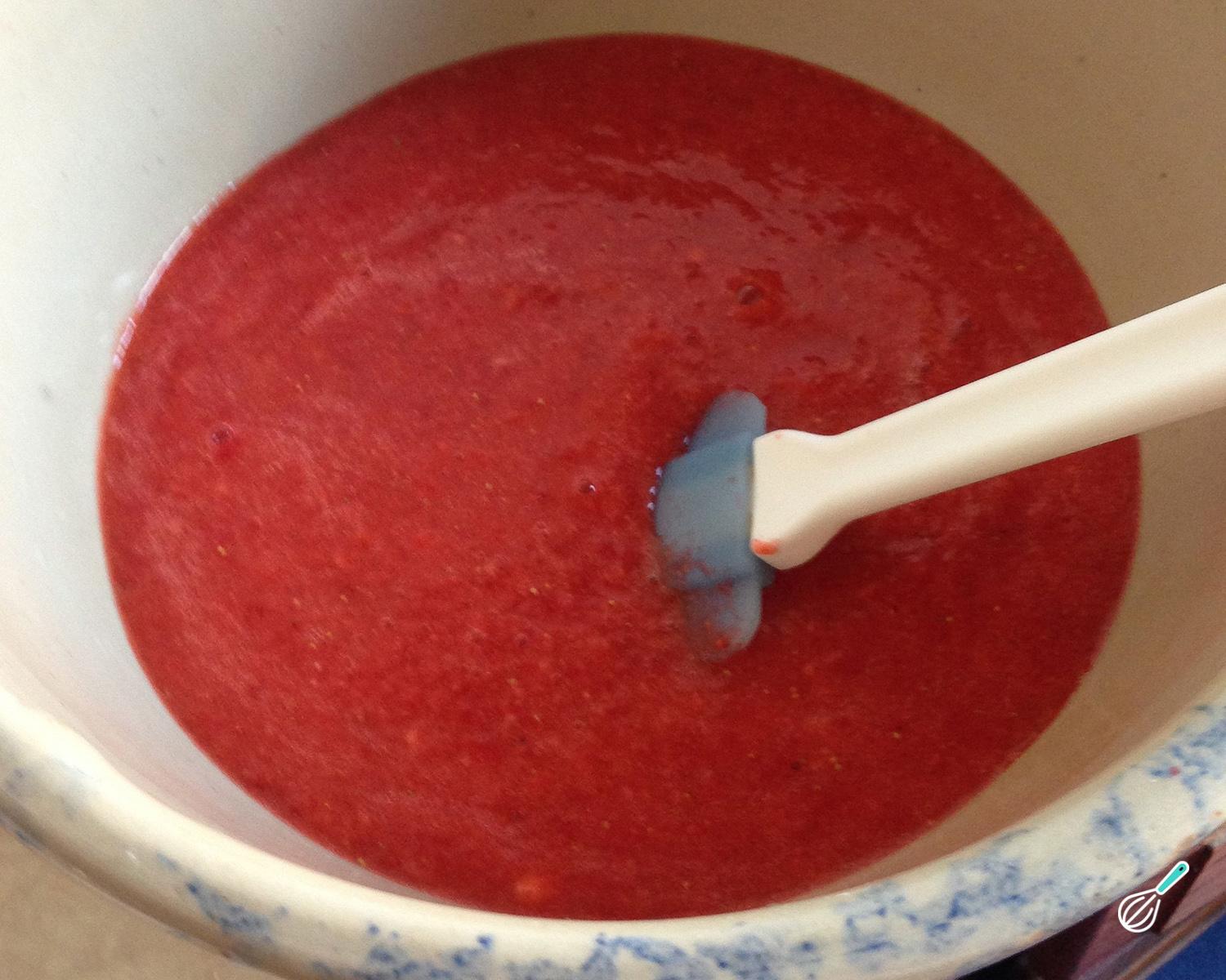 Fique mexendo o suco de morango em fogo médio até obter um coulis de morango, ou seja, uma redução brilhante. Isso é importante para que o recheio do ovo de Páscoa não fique muito mole. Quando o coulis estiver espesso, retire para uma tigela e deixe esfriar.