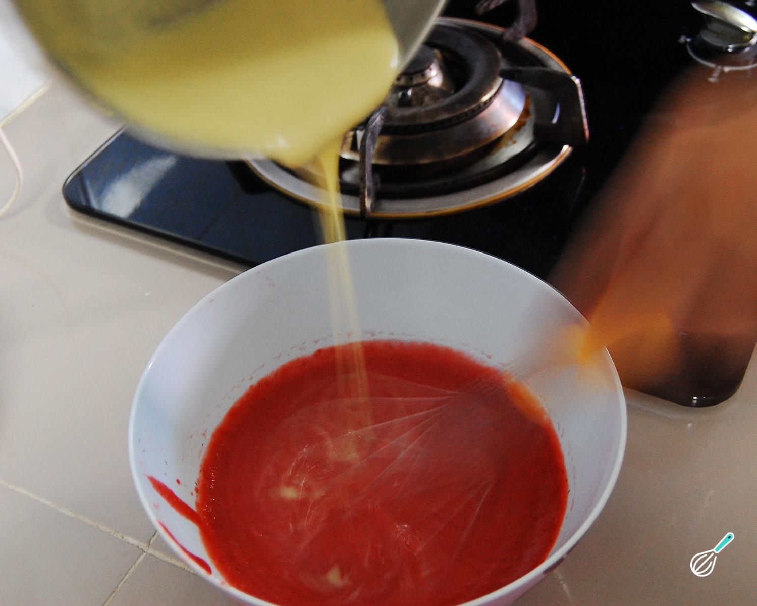 Dissolva a gelatina em um pouco de água e espere um pouco para que fique durinha. Adicione ao creme branco, mexa bem para dissolver, e misture o creme com o coulis de morango. Esse será o recheio desta receita de ovo de Páscoa trufado de morango!