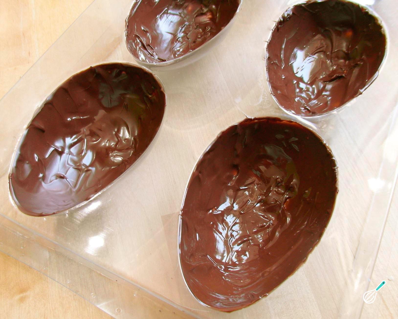 Prepare seu ovo de Páscoa trufado de paçoca começando por derreter o chocolate em banho-maria. Deixe esfriar um pouco e cubra as formas com uma porção, virando a forma para baixo para espalhar o chocolate por todo o espaço, ou espalhando com a ajuda de um pincel ou colher. Leve à geladeira por 20 minutos.