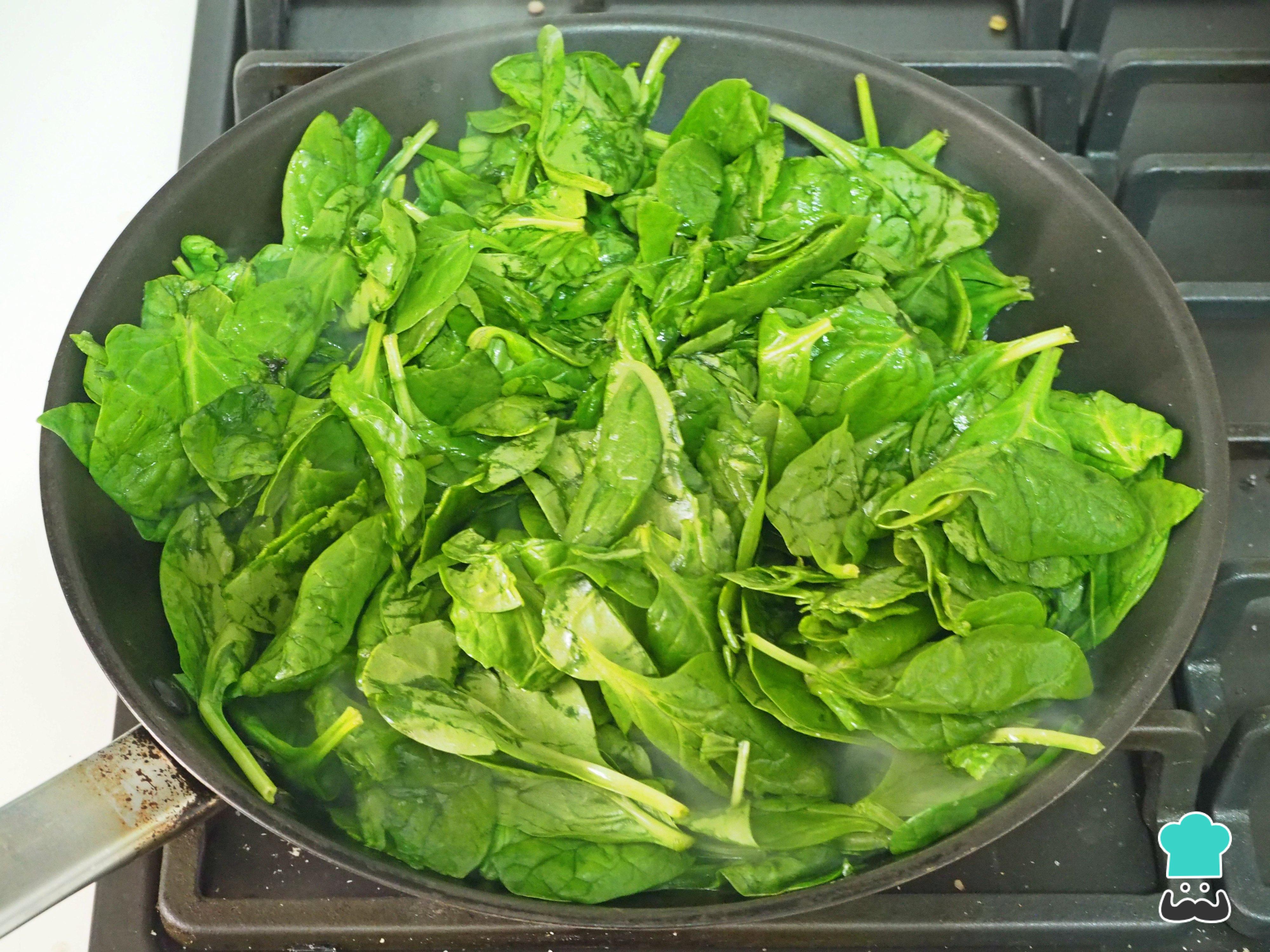 Higienize os espinafres e escorra de modo a eliminar o máximo de água. Leve ao fogo médio uma frigideira com o azeite de oliva e, quando estiver quente, adicione o espinafre. Polvilhe com metade do sal e deixe cozinhar, mexendo de vez em quando, até murchar.