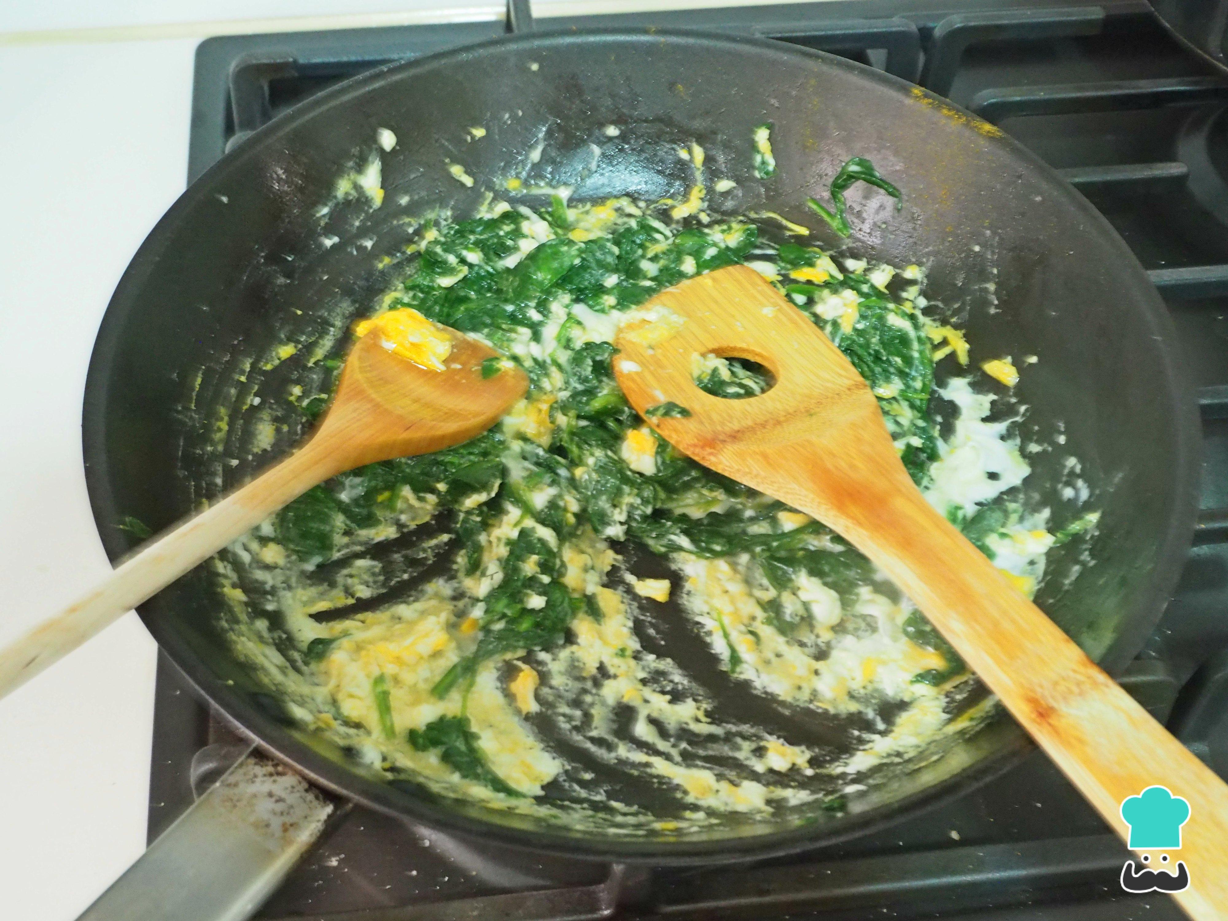 Numa tigela à parte bata os ovos com o restante sal. Quando o espinafre tiver reduzido, adicione os ovos batidos e polvilhe o cominho. Mexa de imediato, para envolver muito bem os ovos com o espinafre e evitar que grudem na frigideira.