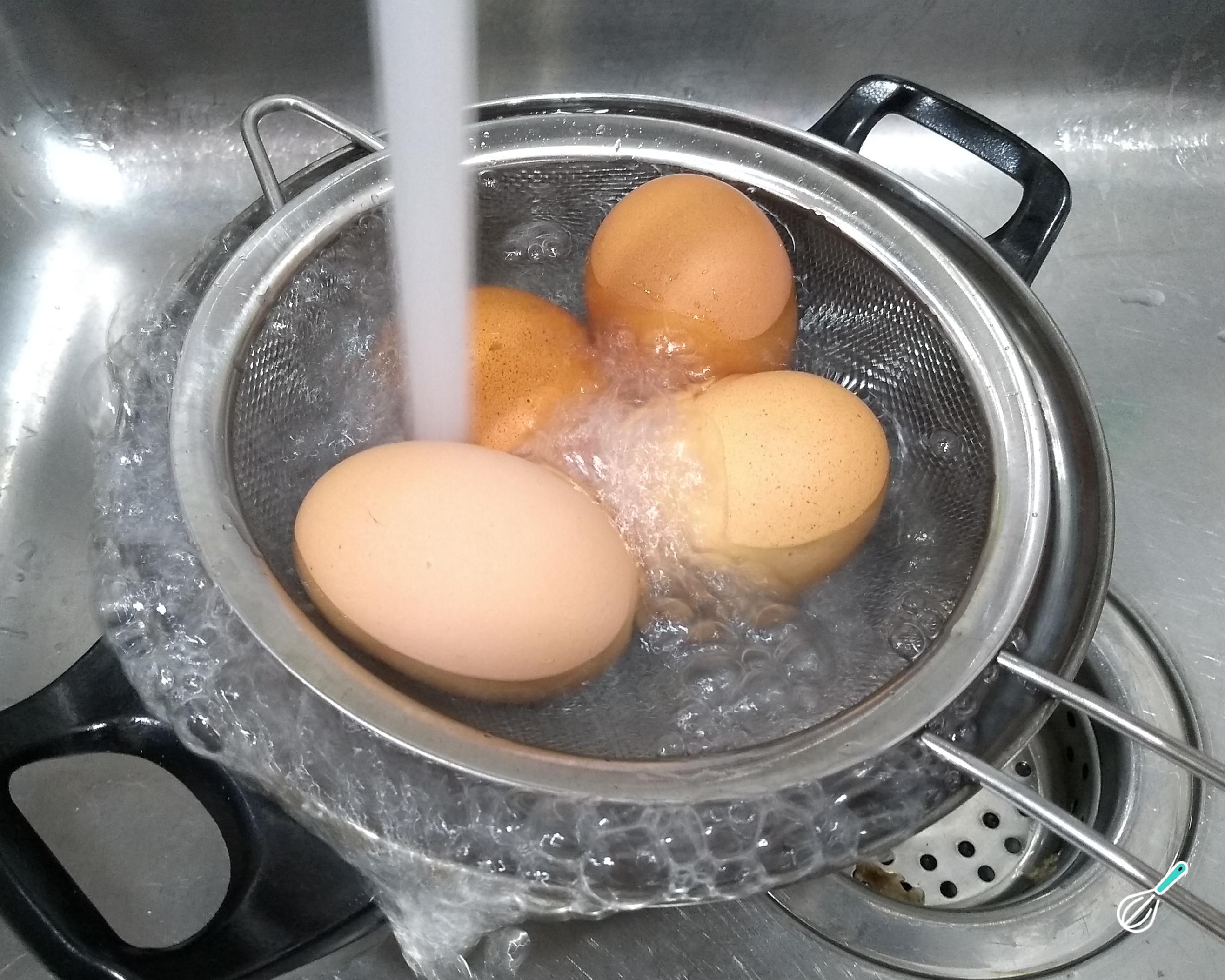 Em seguida passe os ovos por água fria corrente, para parar o cozimento e impedir que as gemas endureçam. Escorra e deixe esfriar um pouco, para que você possa pegá-los sem queimar. Descasque os ovos com cuidado e reserve.