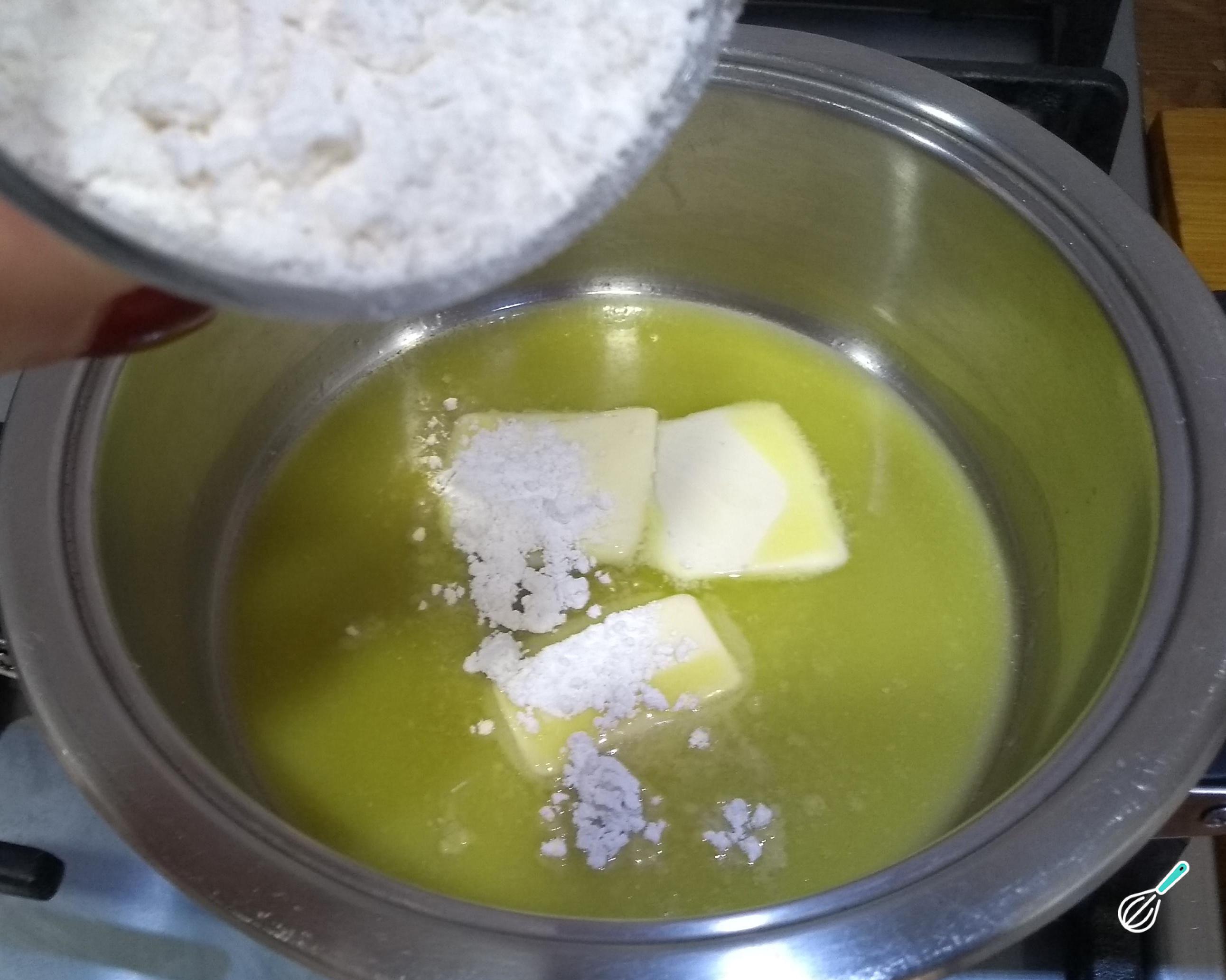 Prepare um molho branco, que vai deixar esta receita de ovo mollet à milanesa ainda mais gostosa! Derreta a manteiga em uma panela e adicione a farinha aos poucos, mexendo com uma colher.