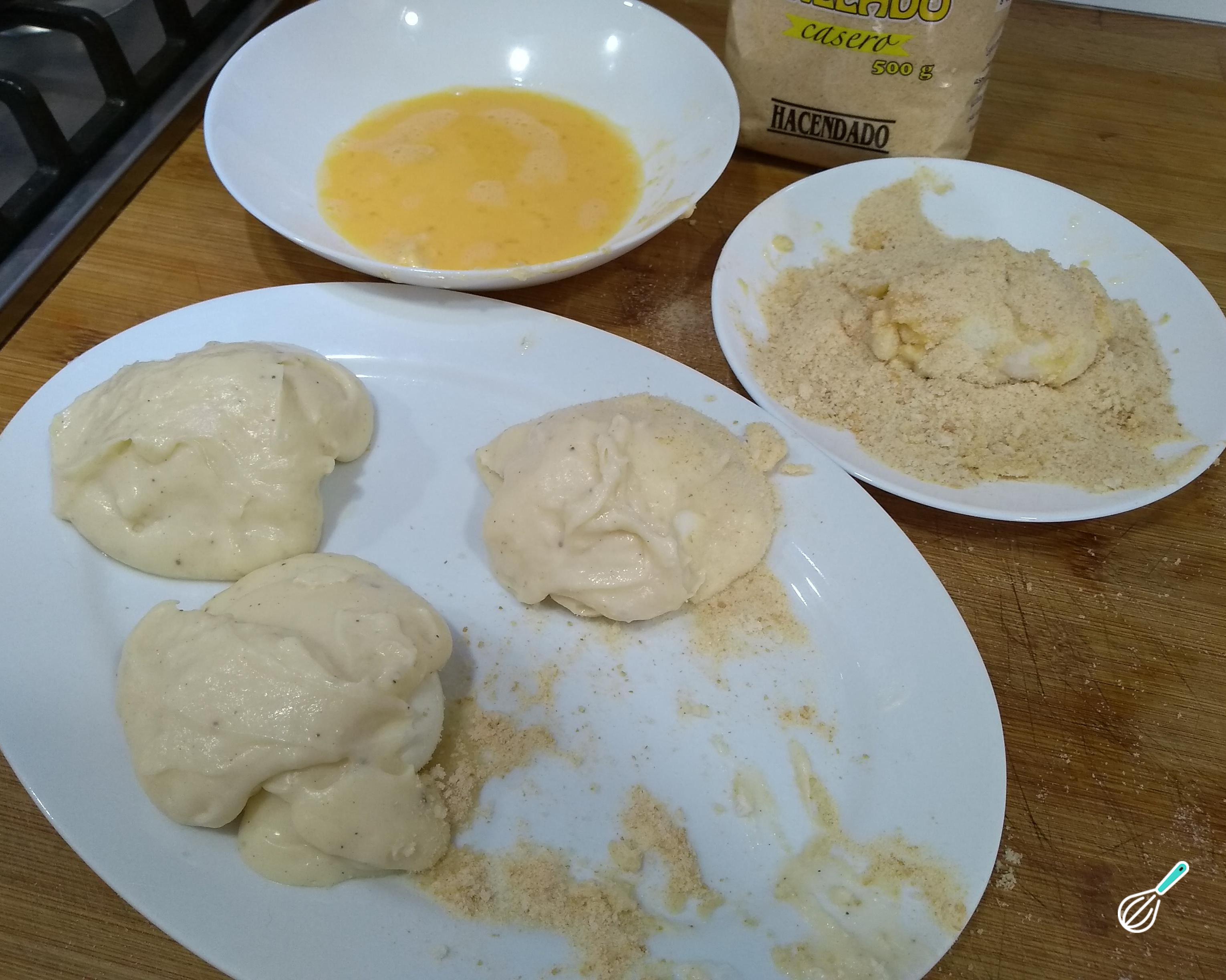 Descasque os ovos e passe-os pelo molho branco preparado no passo anterior. Depois polvilhe farinha de rosca neles, o suficiente para não ficarem pegajosos. Bata o ovo restante e passe os ovos cremosos por ele, depois por farinha de rosca novamente.