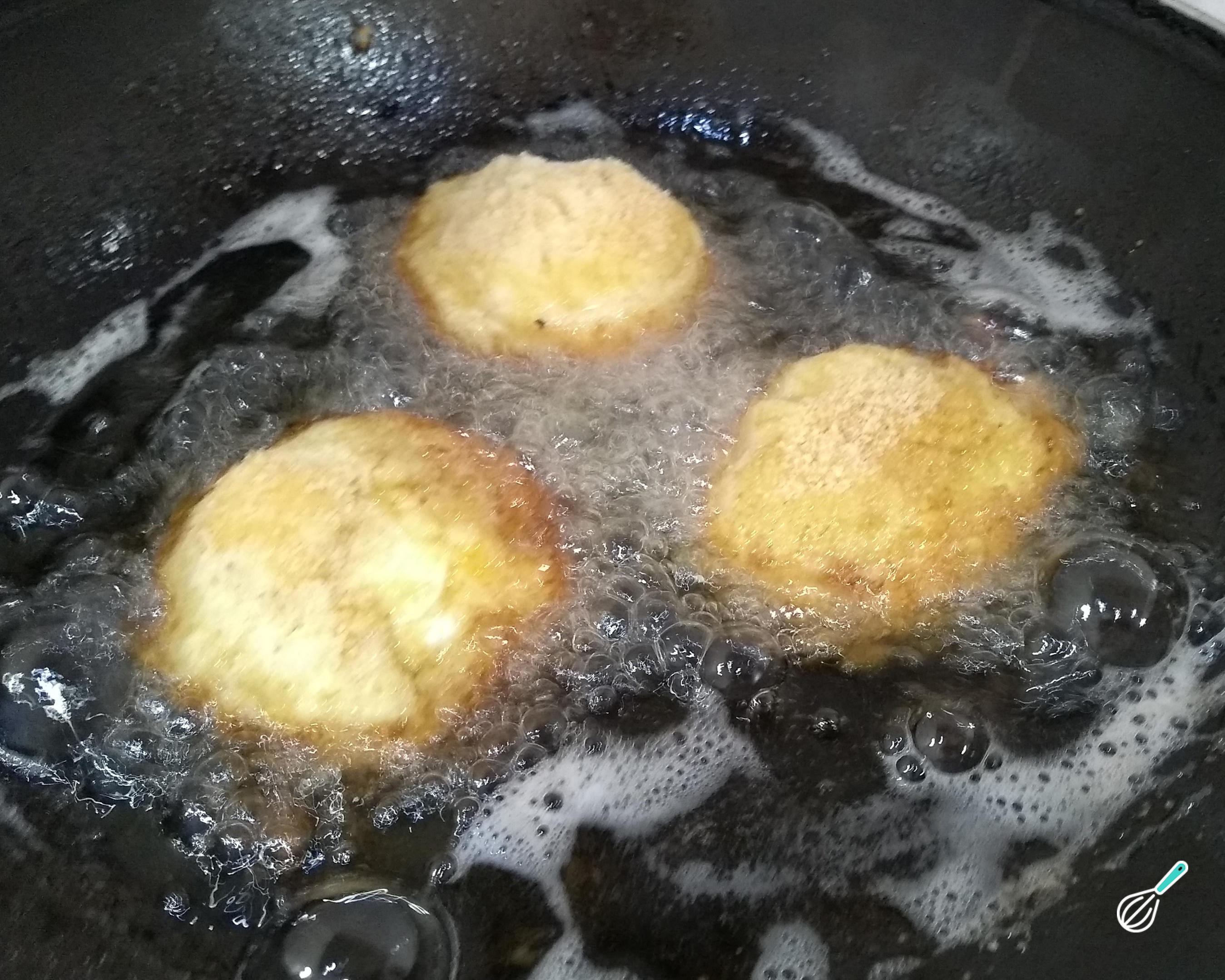 Repita o processo mais uma vez e modele com as mãos, para que os ovos fiquem o mais redondinhos possível. Aqueça o óleo em uma panela no fogo alto e, quando estiver quente, coloque os ovos mollet para fritar. Deixe até ficarem dourados.
