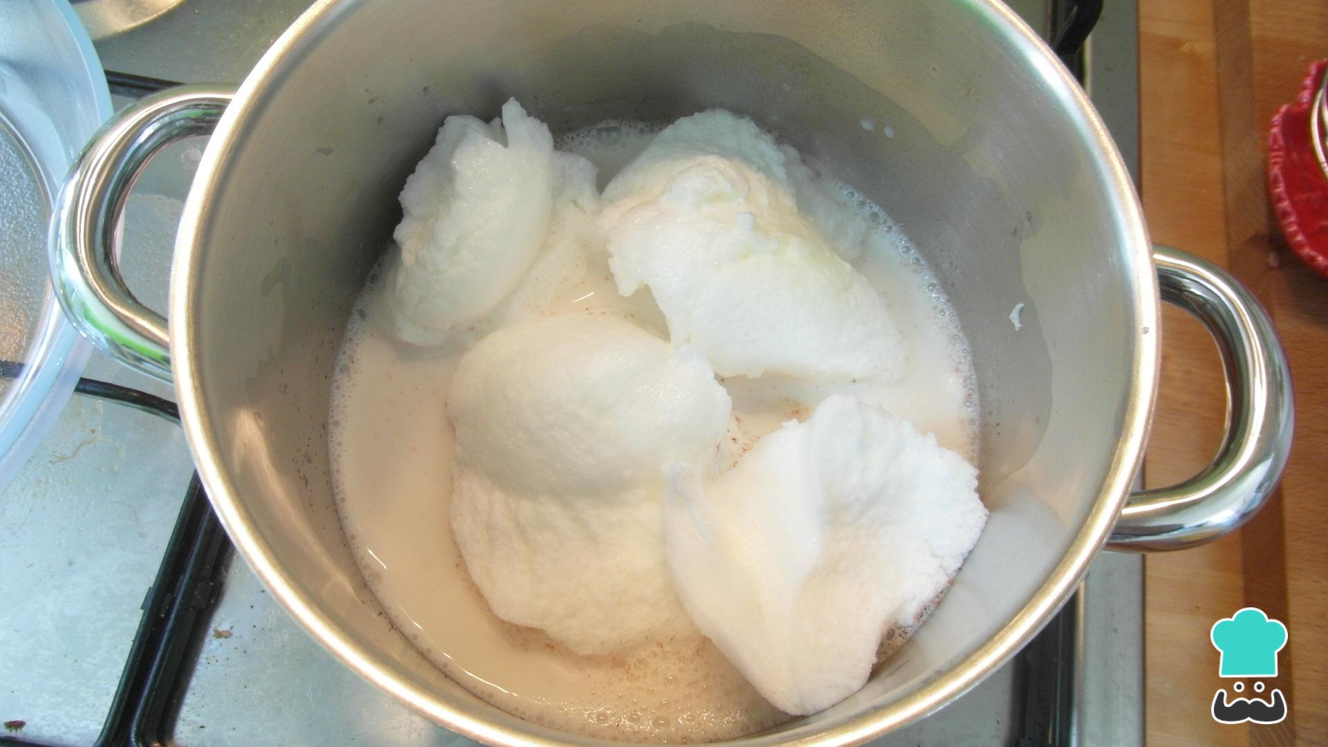 Quando o leite ferver, adicione-lhe 3 ou 4 colheres das claras de ovo batidas e deixe cozinhar por 1-2 minutos sem tampar.