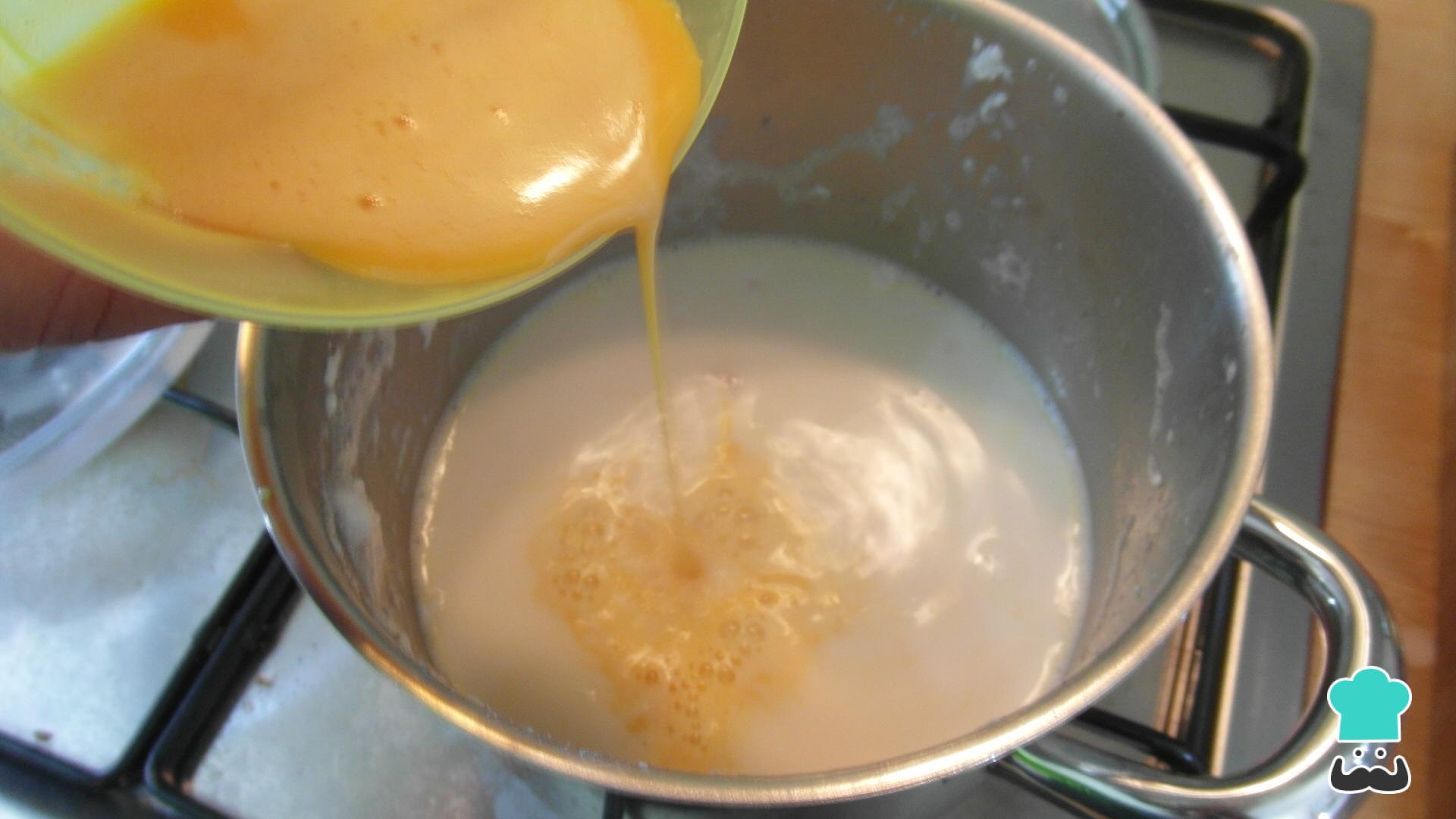 Para preparar a calda dos ovos nevados acrescente o restante leite à panela e a manteiga, e aguarde até ferver. Enquanto isso, misture as gemas de ovo com a maisena.