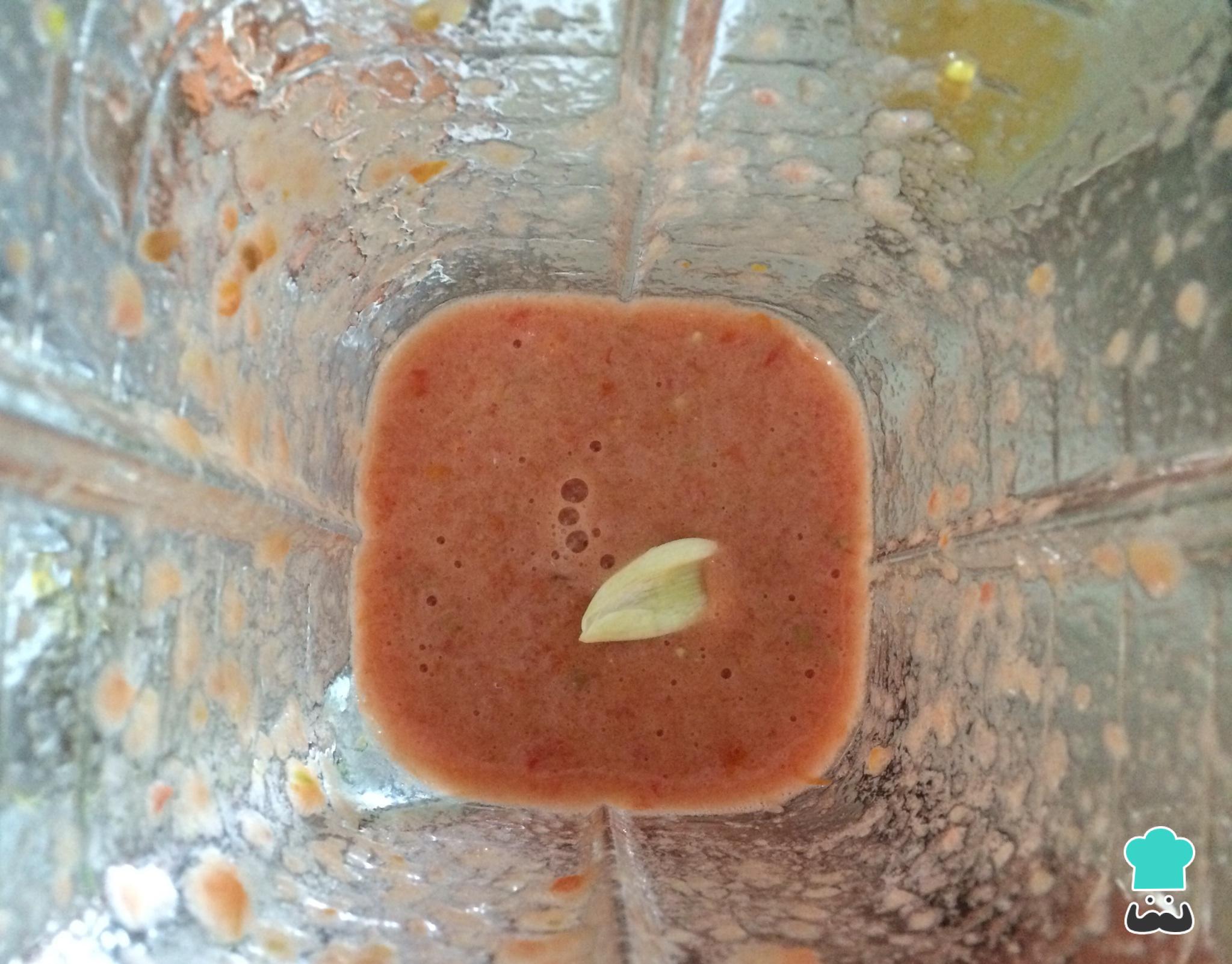 Depois acrescente o dente de alho, um pouco de azeite, sal e pimenta a gosto, e volte a bater até ficar homogêneo. Coe este suco, para eliminar os pedaços que possam ter restado.