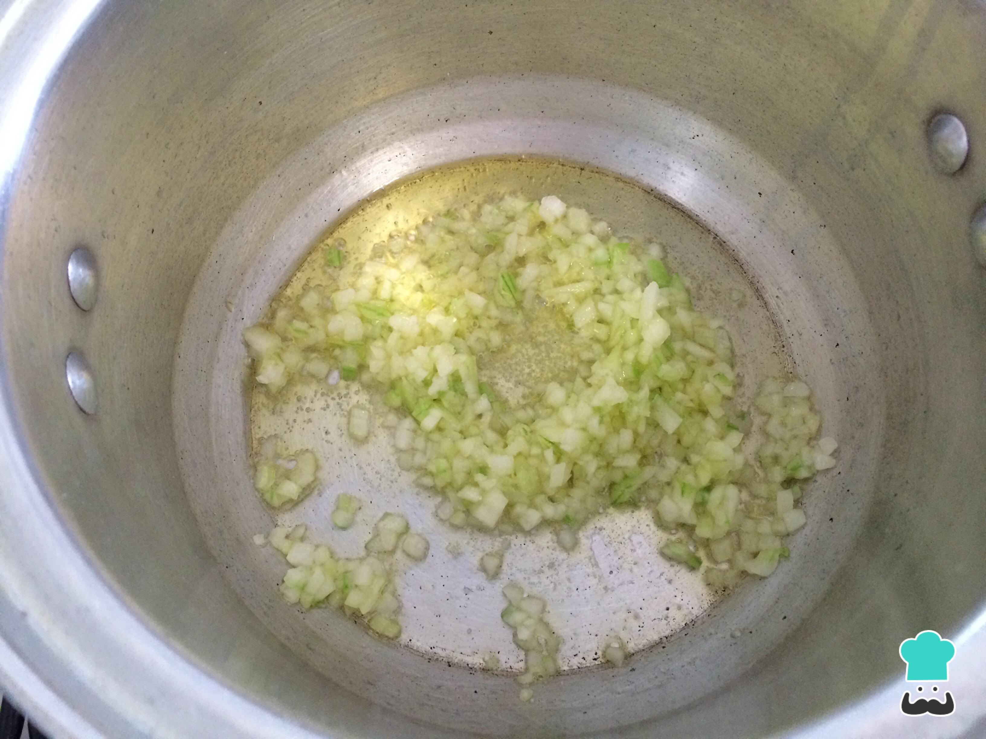 Coloque azeite em uma panela e refoque a cebola cortada muito finamente com um pouco de sal, até que fique translúcida.