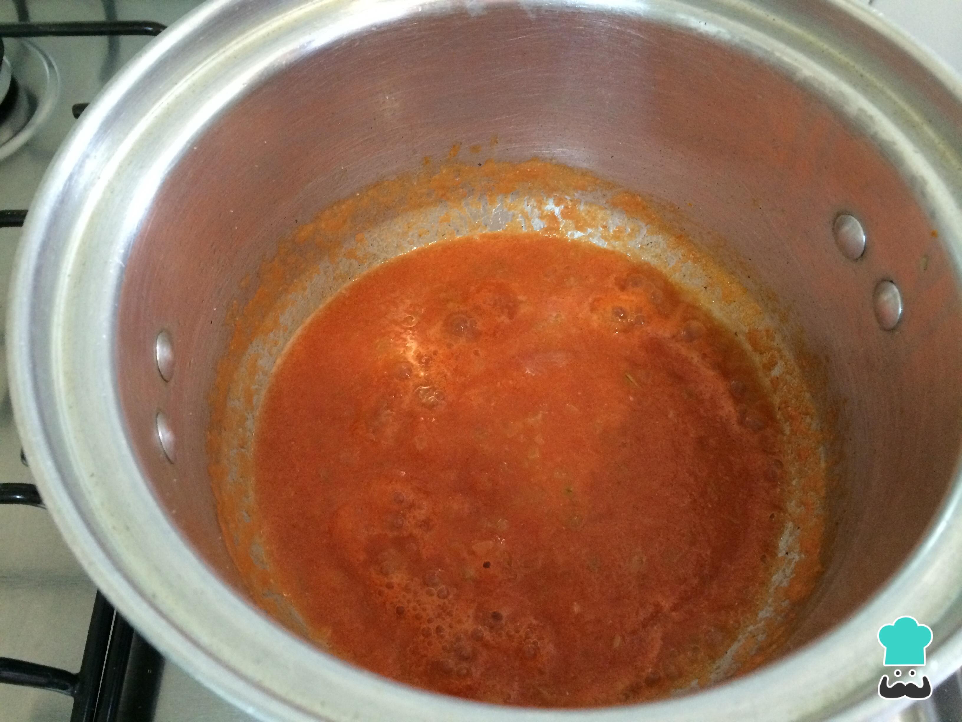 Acrescente o suco preparado no liquidificador e cozinhe este molho à napolitana em fogo baixo por 20 minutos. Retifique o sabor com sal, pimenta e açúcar, que ajudará a regular a acidez do tomate.