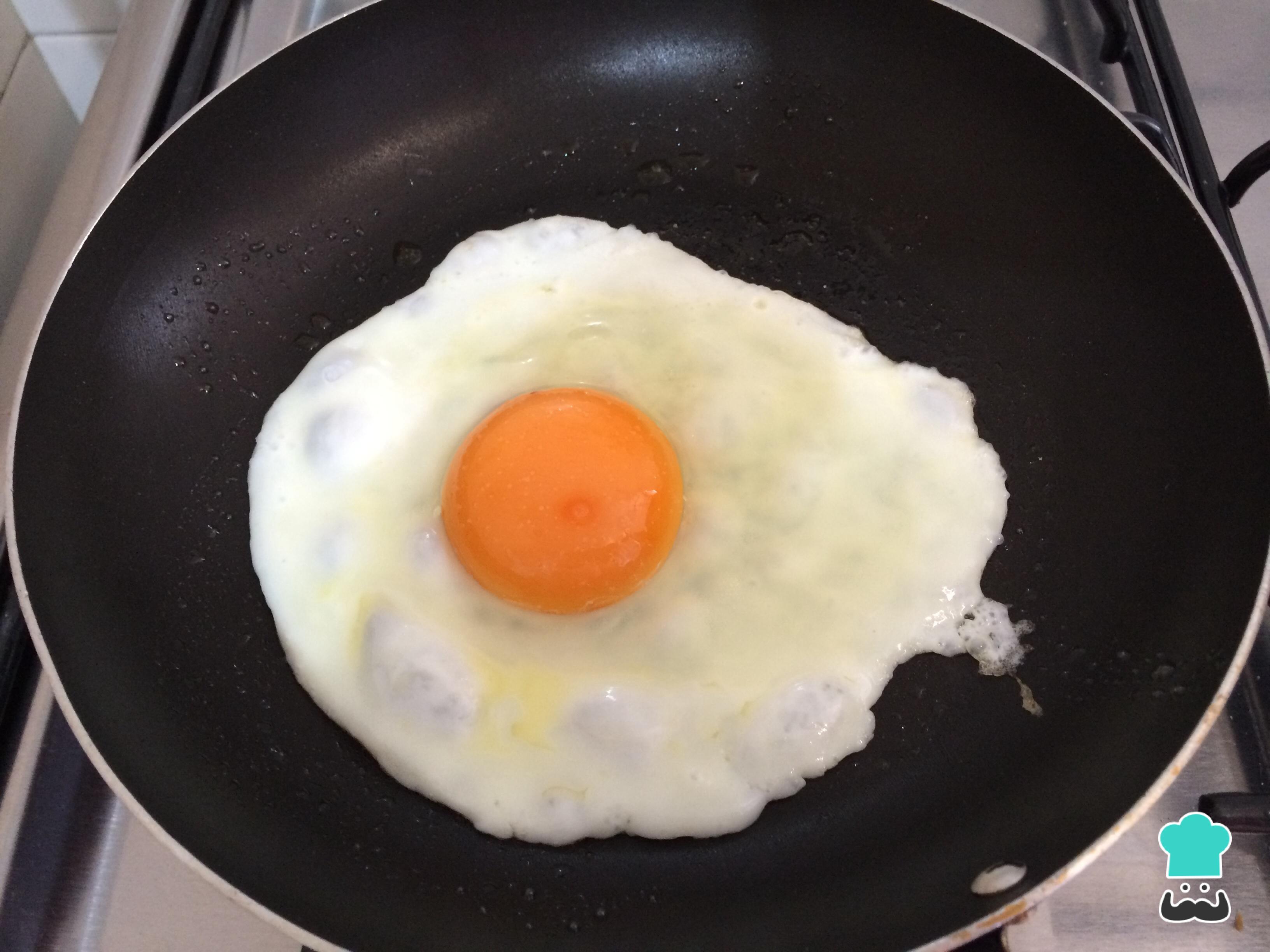Enquanto isso, leve ao fogo baixo uma frigideira com o azeite ou óleo de girassol e frite o ovo temperado com um pouco de sal, até que a clara fique completamente branca. Se quiser a gema cozinhada, tampe a frigideira enquanto o ovo frita.
