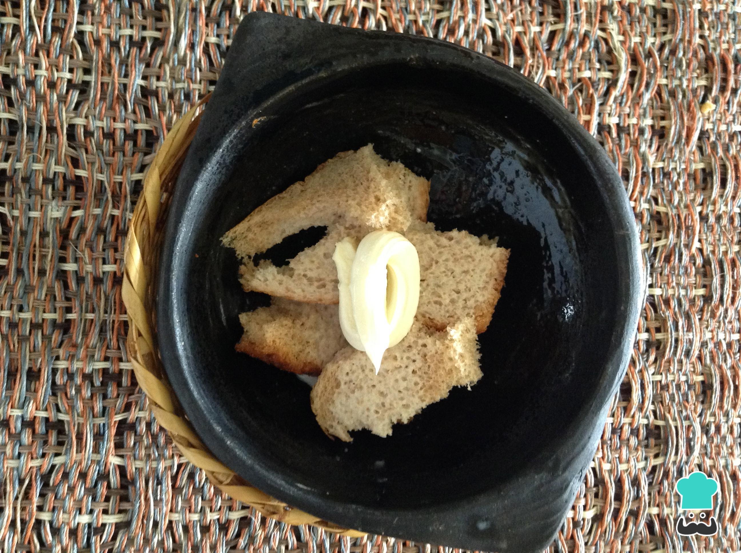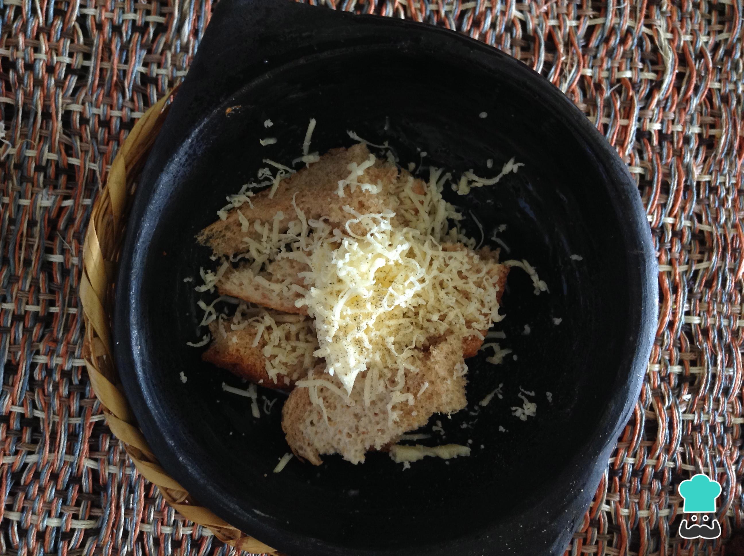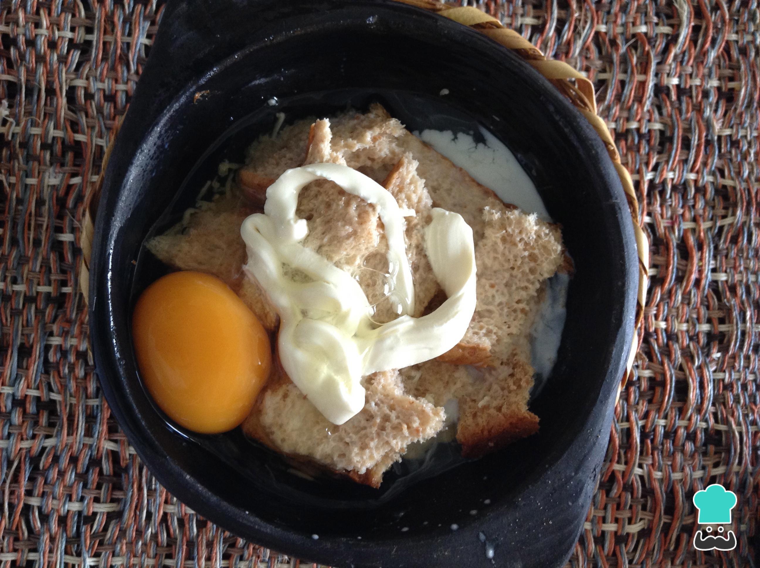 Unte uma caçarola ou ramequim com manteiga e coloque uma fatia de pão despedaçado com as mãos e um pouco de creme de leite.
