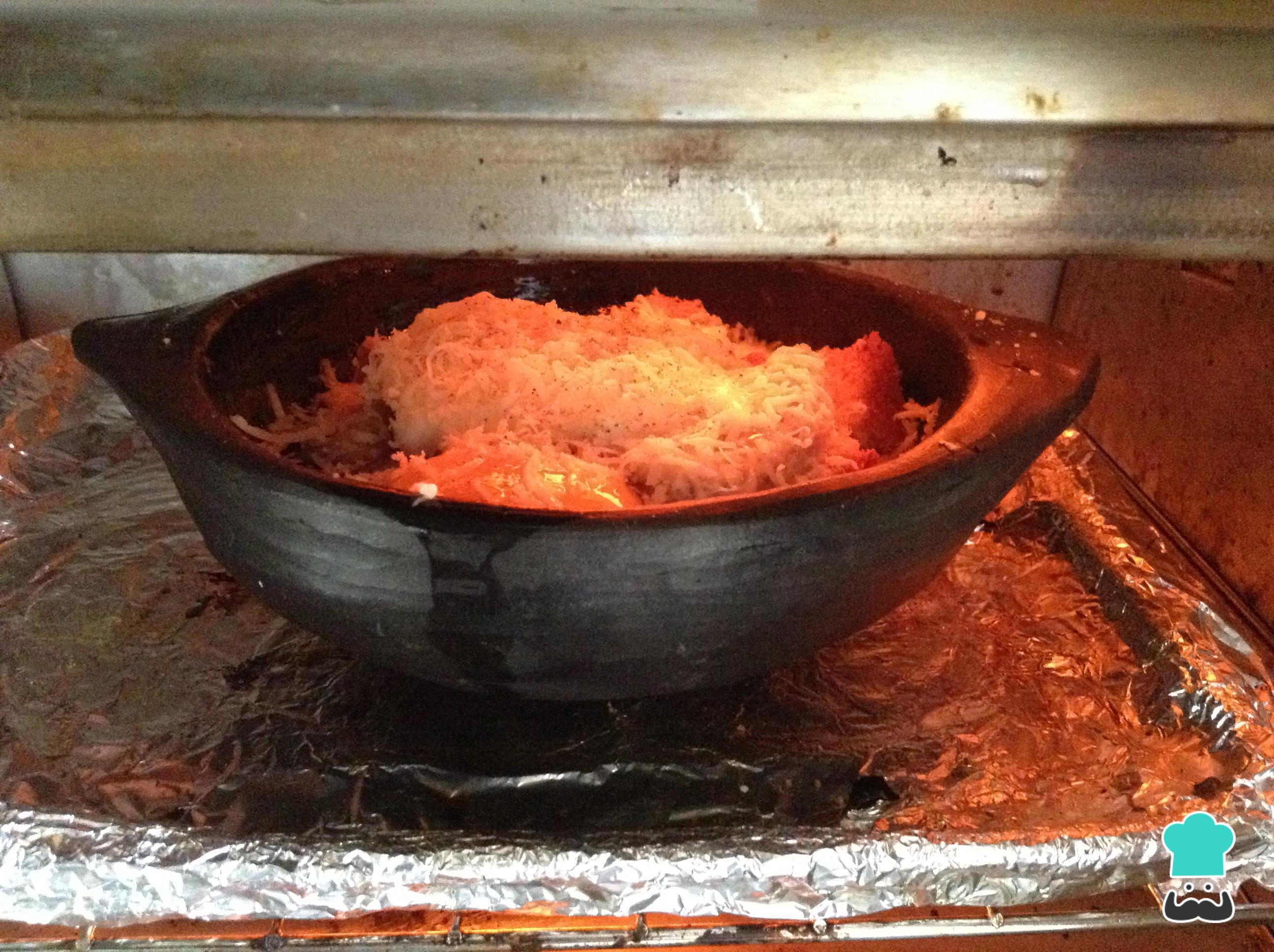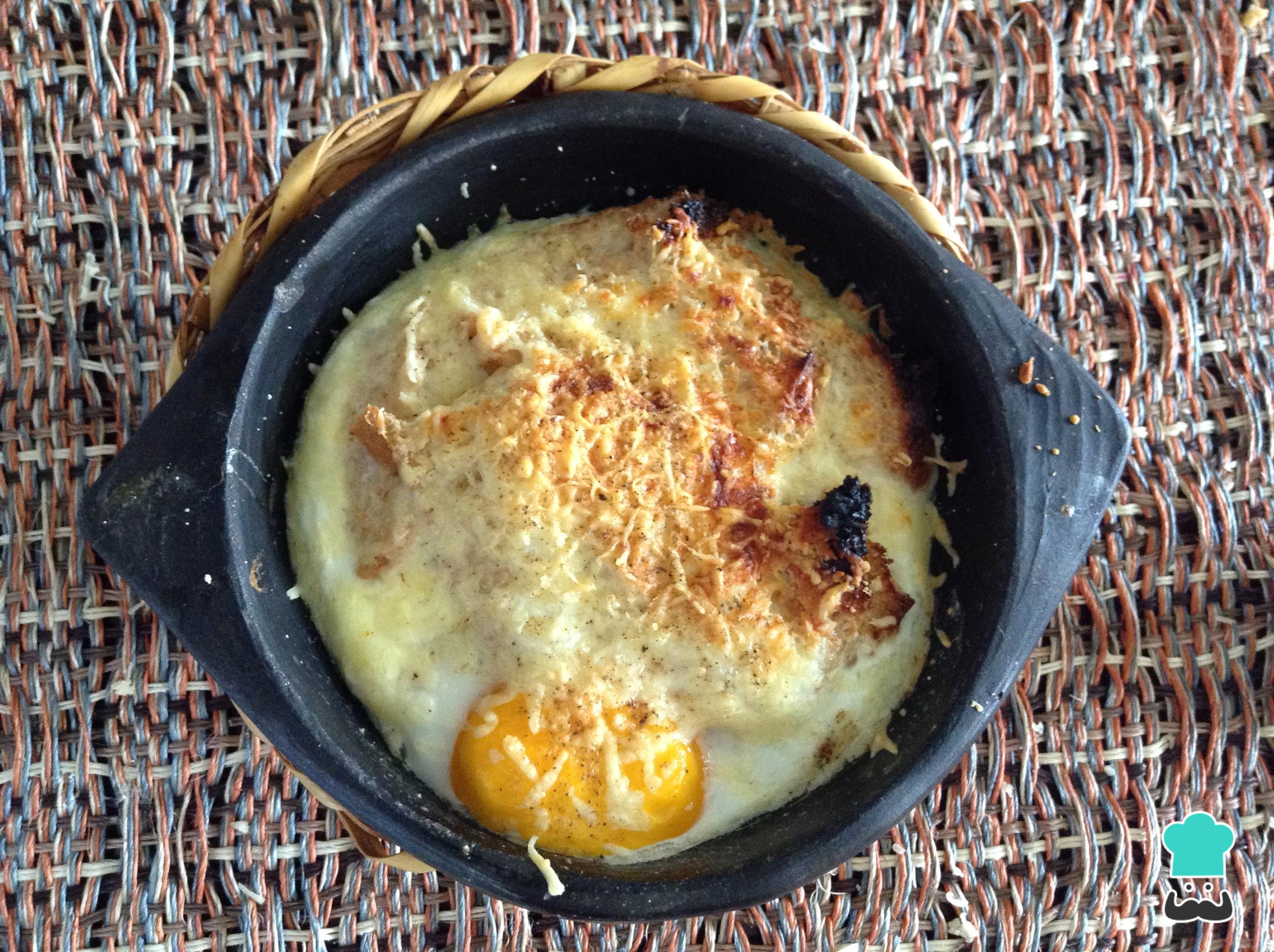 Leve o preparado ao forno preaquecido a 180ºC até que o queijo gratine e o ovo cozinhe.