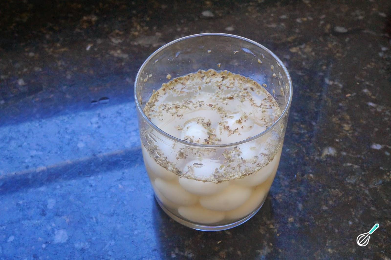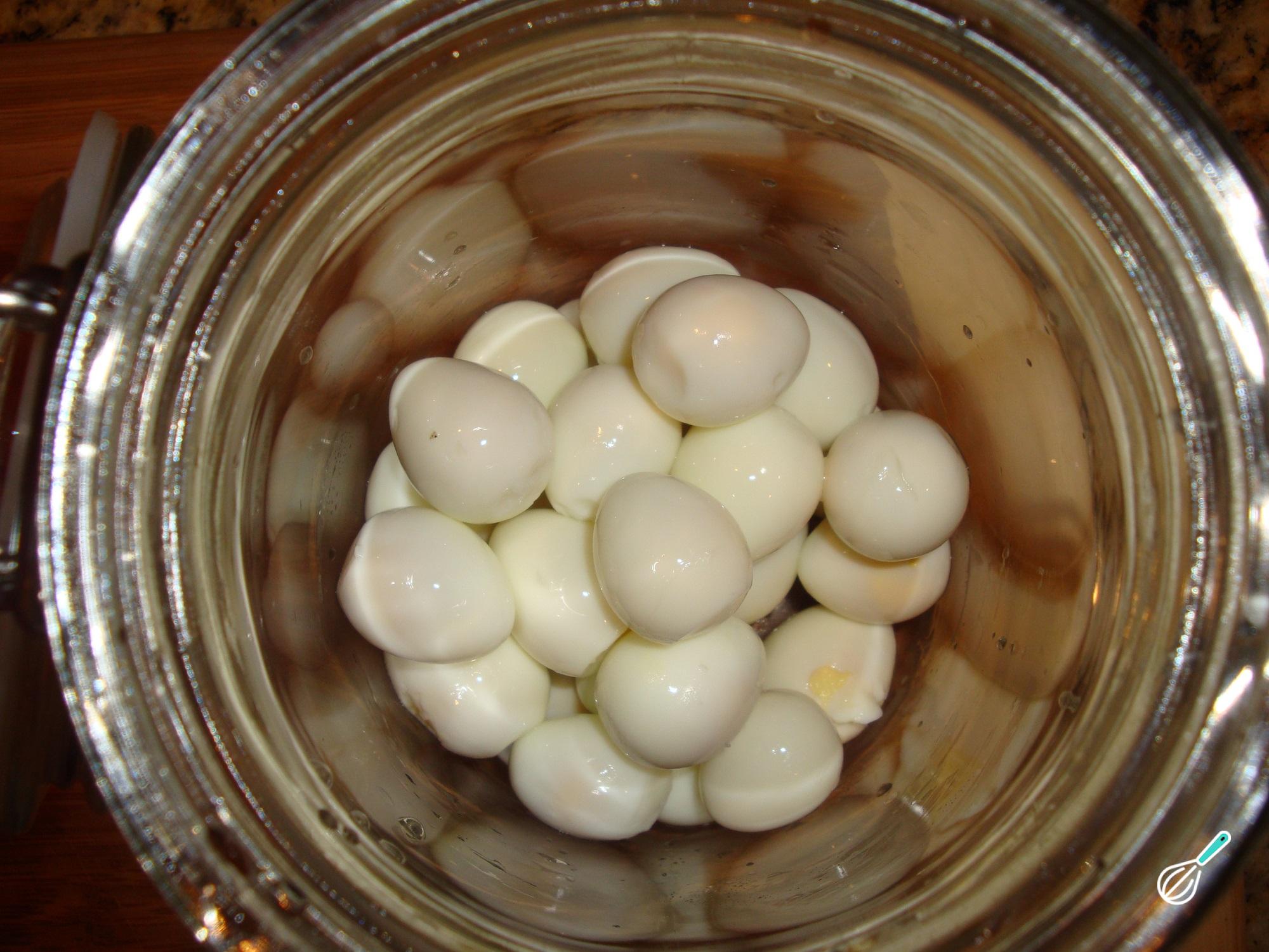 Tampe bem o frasco e reserve os ovos de codorna em conserva de um dia para o outro.