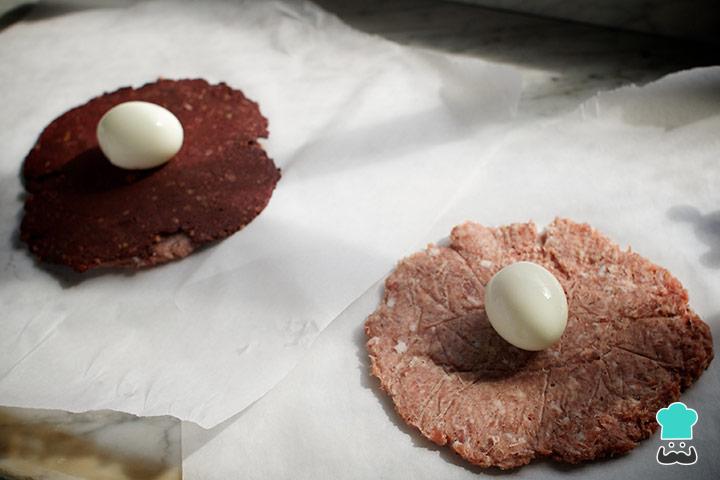 Numa superfície lisa e plana revestida com papel manteiga, espalme algumas porções do preparado de carne picada. No centro coloque um ovo cozido já descascado e envolva-o com a carne, formando uma bola.