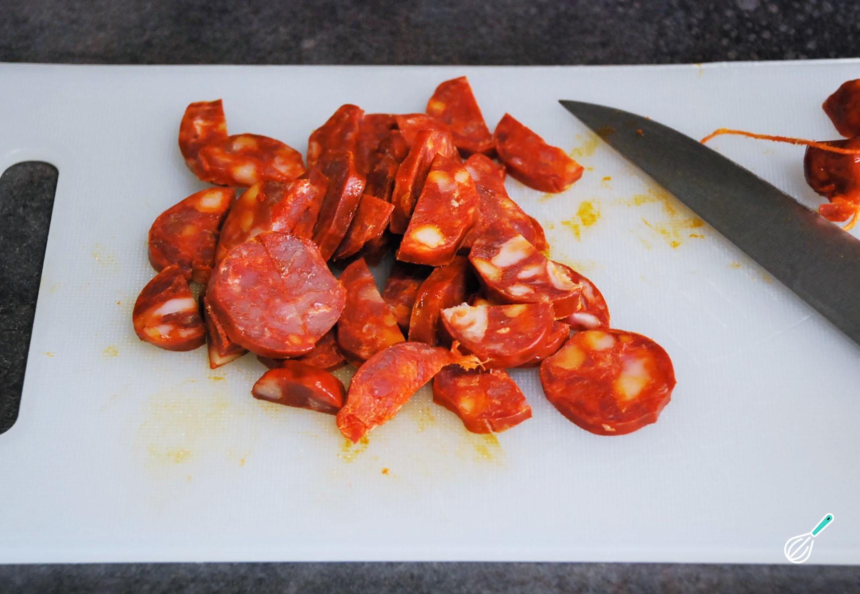 Para começar preparando esta receita portuguesa, comece por cortar o chouriço em rodelas finas.