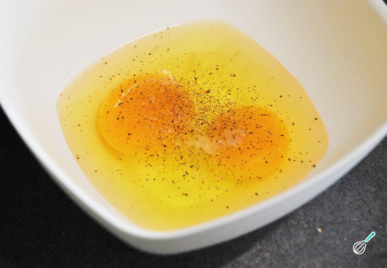 Separadamente, bata os ovos em uma tigela e tempere com um pouco de sal e pimenta.