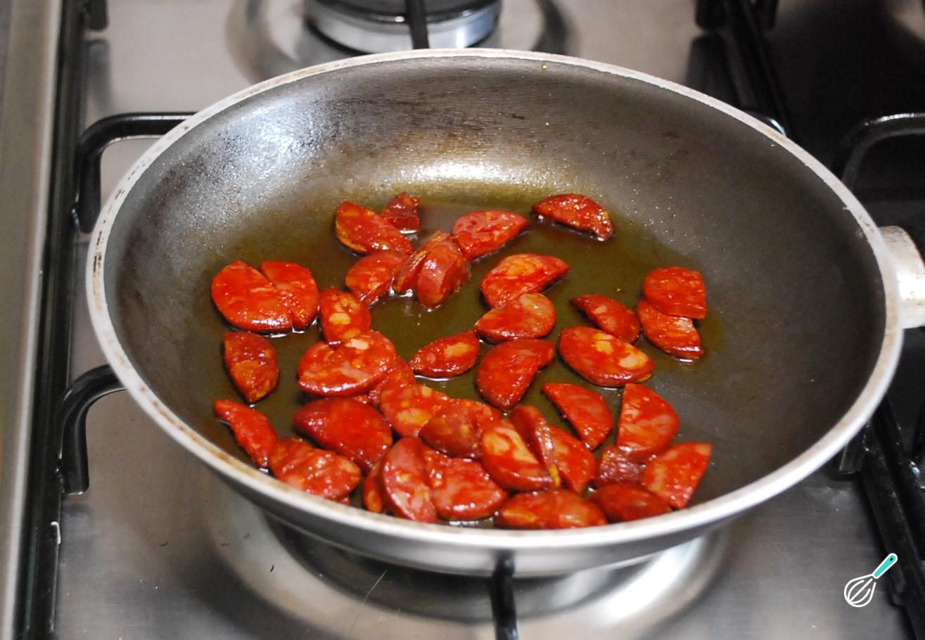 Leve ao fogo médio uma frigideira e frite o chouriço na própria gordura, até ficar ligeiramente dourado.