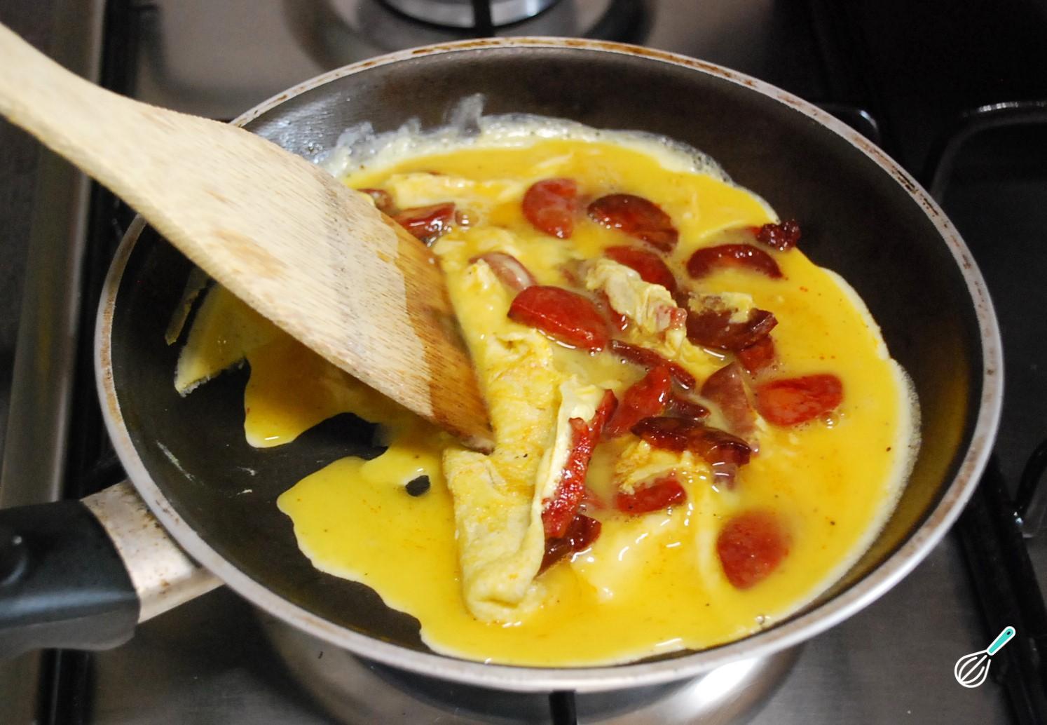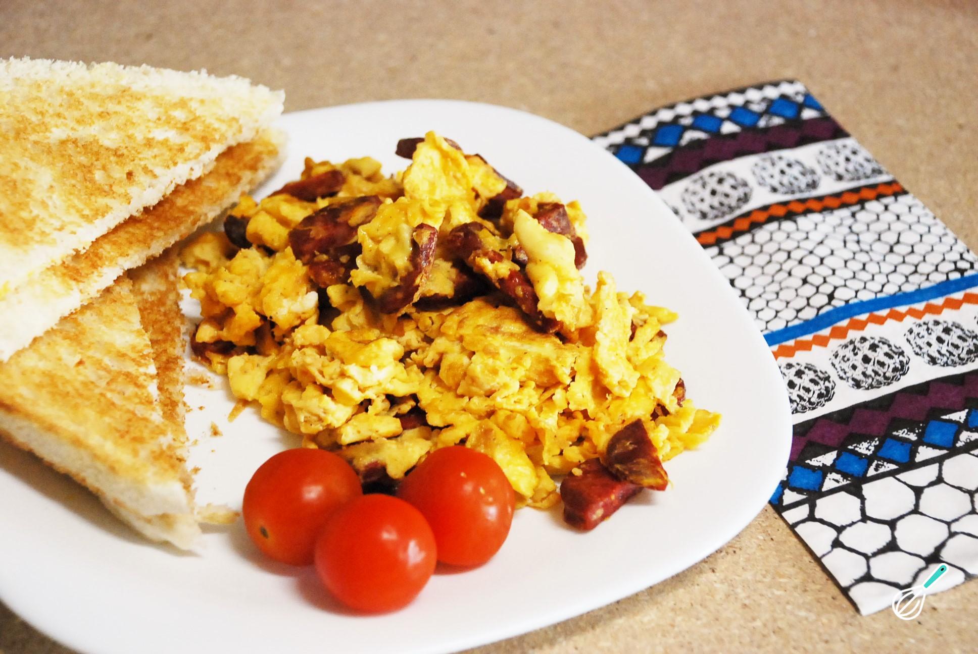 Dica: Se o chouriço soltar muita gordura, escorra uma parte dela, caso contrário os ovos mexidos ficarão muito gordurosos.