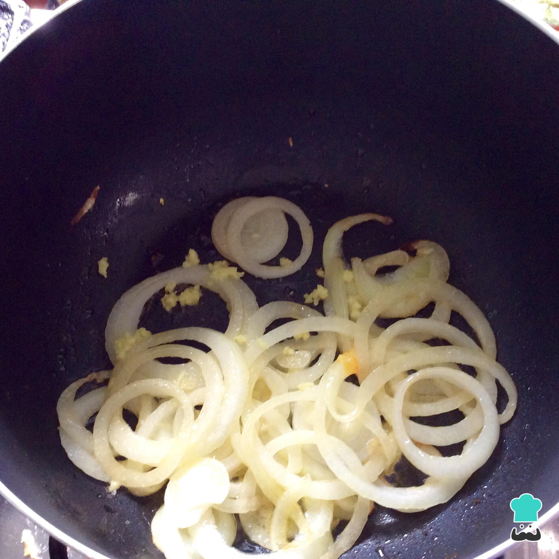 Em uma panela em fogo alto, derreta manteiga e refogue por 3 minutos a cebola cortada em rodelas junto com o gengibre ralado.
