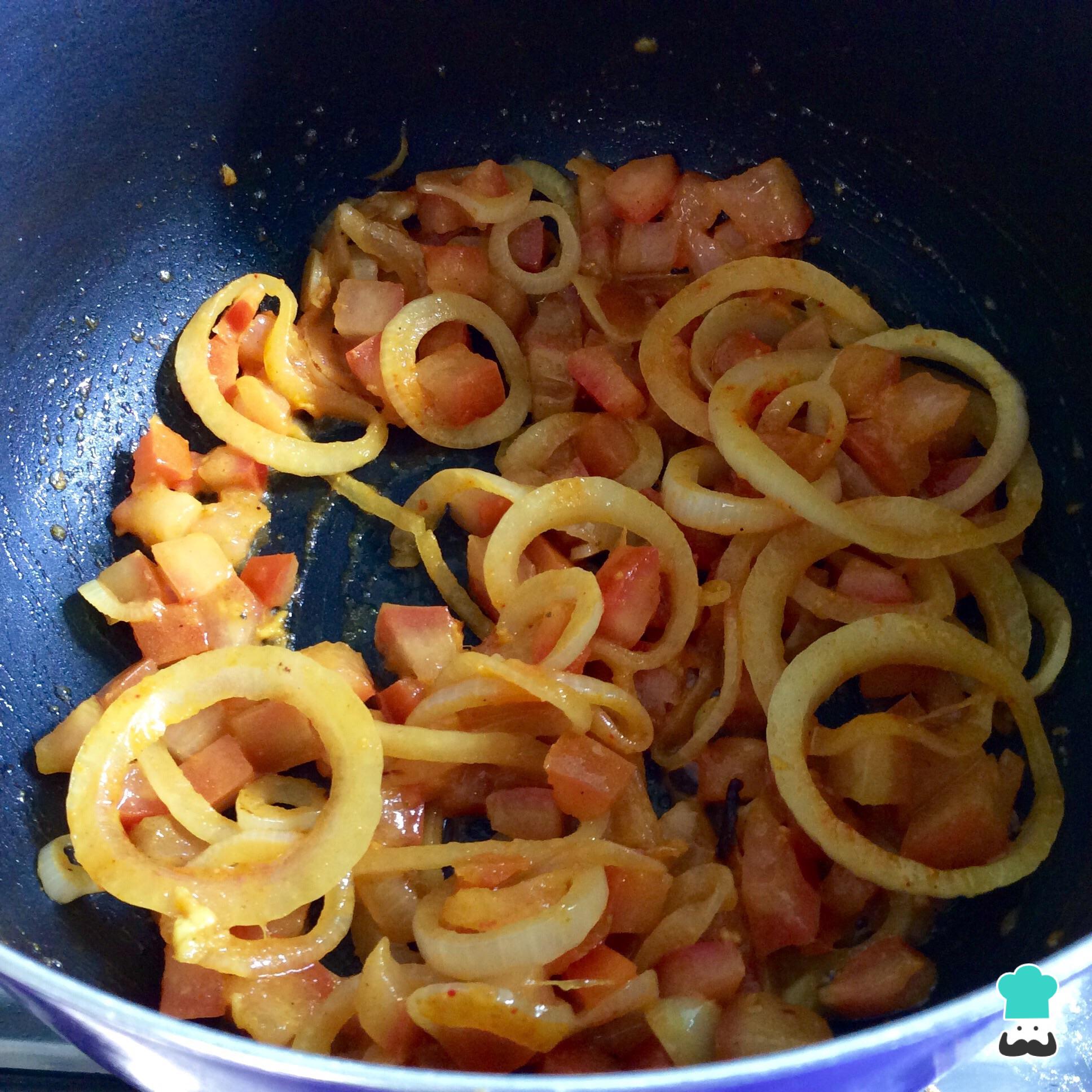 Após o tempo indicado, o passo seguinte desta receita de ovos mexidos é adicionar o tomate em cubos e sem sementes, e uma pitada de caril em pó. Certifique-se de que mistura tudo muito bem, para que os ingredientes absorvam o curry. Cozinhe em fogo baixo por mais 3 minutos.