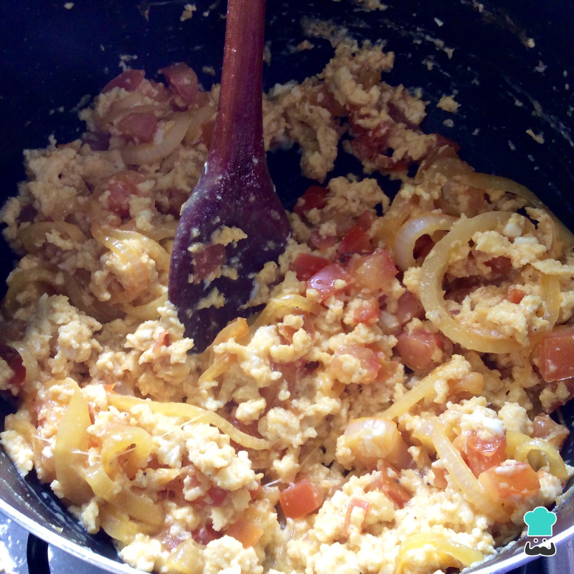 Adicione os ovos batidos à preparação de cebola e tomate e misture até que os ovos fiquem cozinhados.