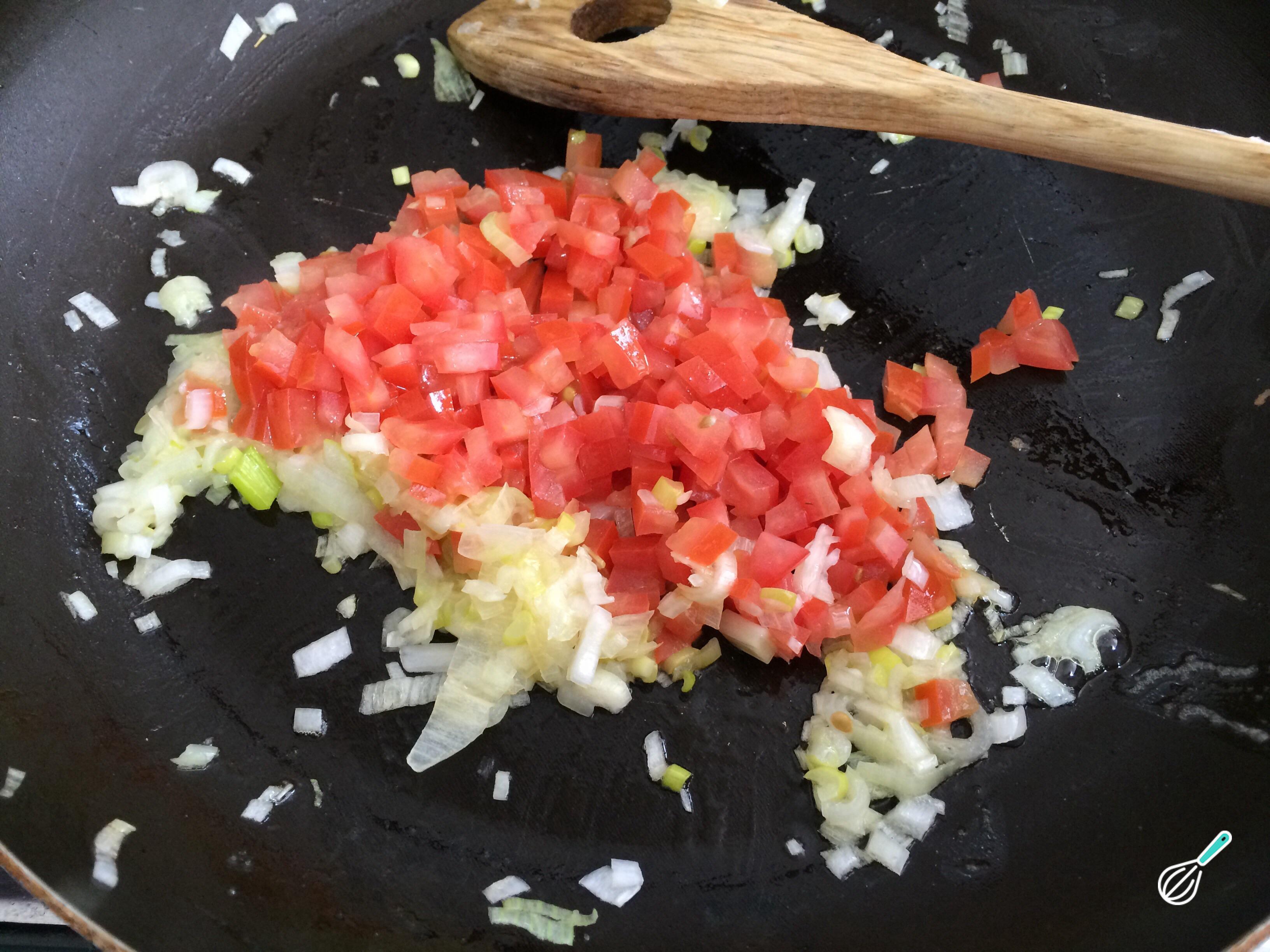 Em uma frigideira com manteiga, refogue o alho-poró e o tomate sem sementes, cortado finamente, até que estejam macios. Junte uma pitada de sal e pimenta do reino.