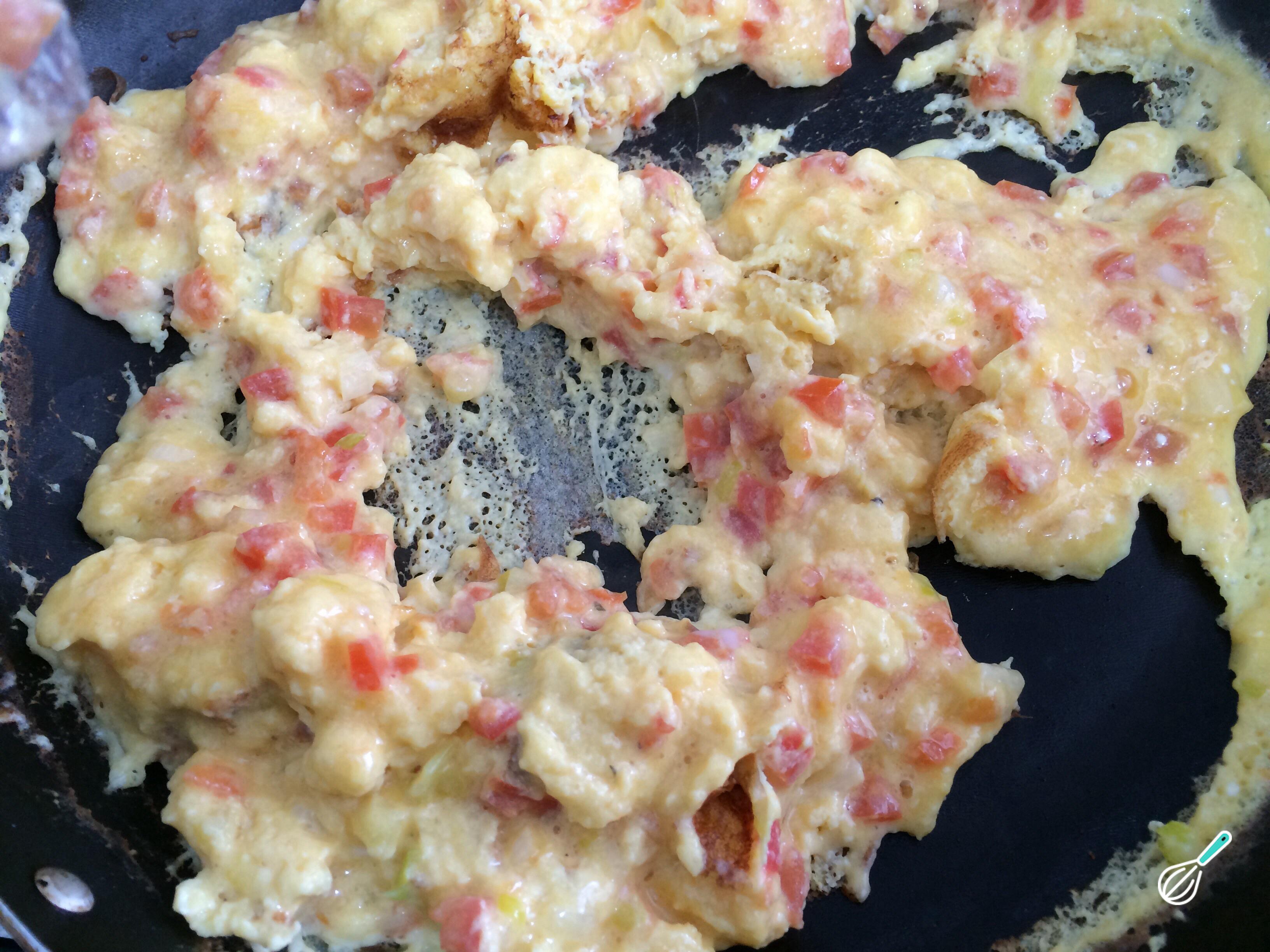 Adicione os ovos à frigideira e vá mexendo constantemente até os ovos estarem cozinhados.