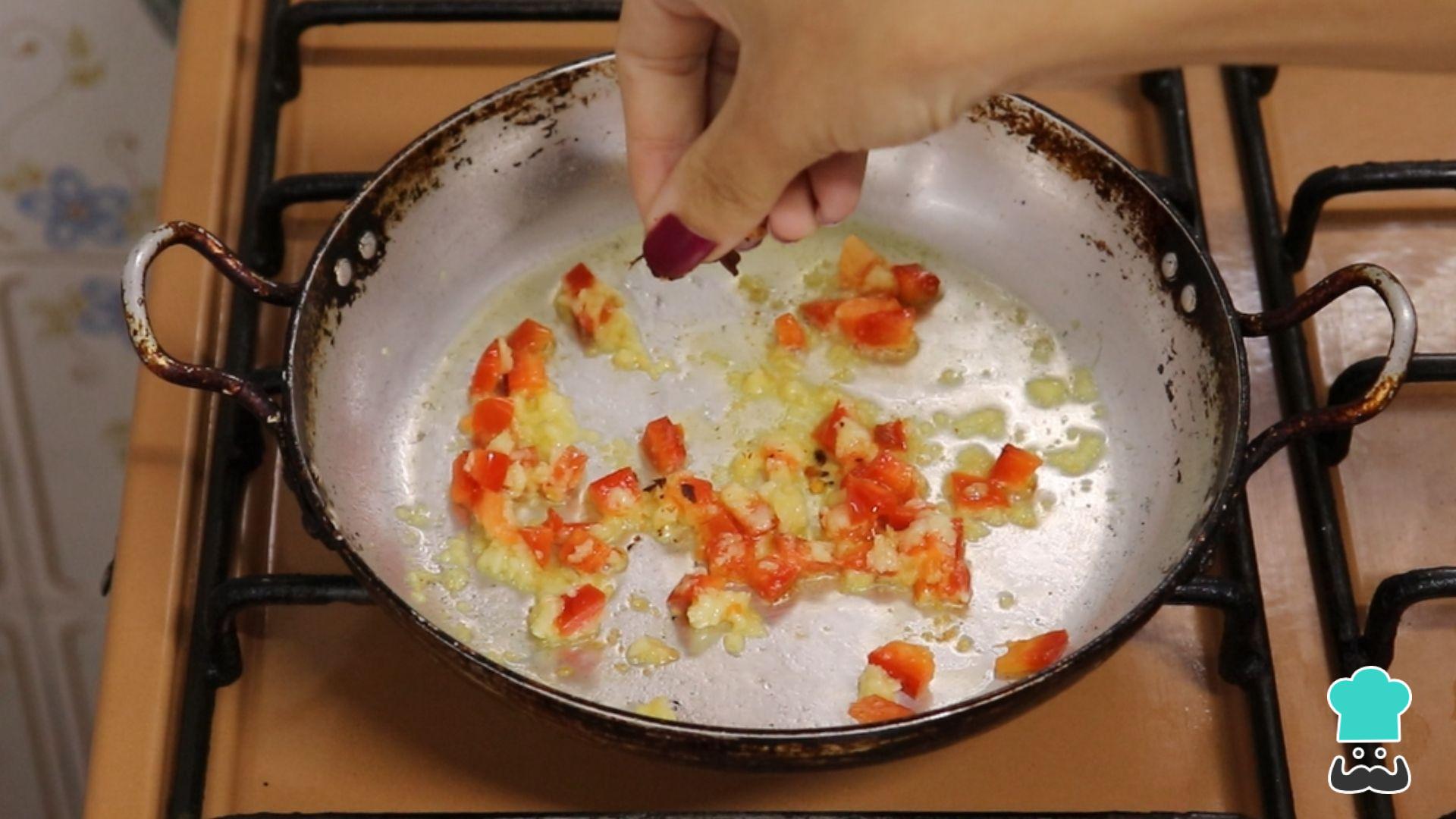 Comece refogando no fogo médio a cebola e o pimentão no azeite. Quando murchar, acrescente o alho, uma pitada de sal e uma pitadinha de pimenta calabresa (lembre-se de que ela é bem forte, então é melhor acrescentar aos pouquinhos). Mexa por 1 minuto.