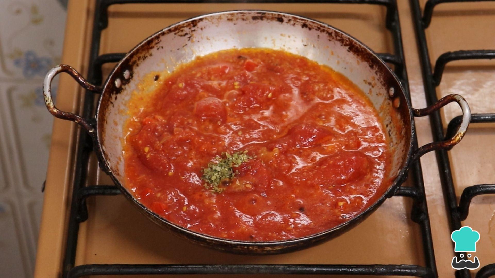 Abaixe o fogo e despeje o tomate pelado. Misture bem e tempere com o orégano e mais uma pitada de sal. Deixe o molho no fogo por 3 minutos para encorpar.