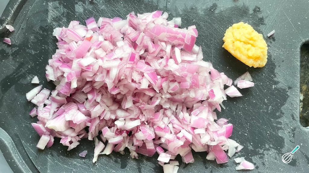 Pique a cebola roxa em cubos e o alho. Reserve.