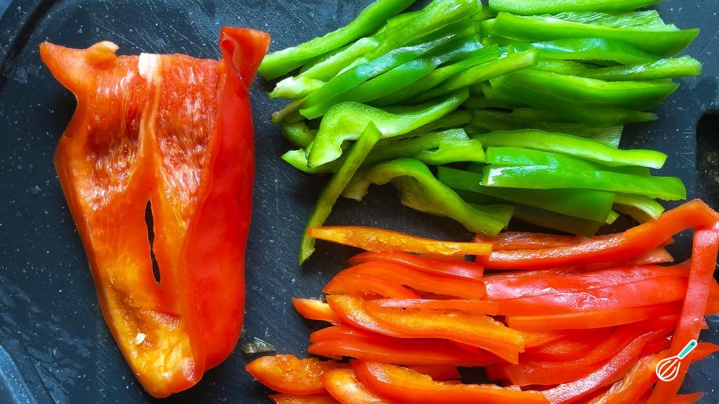 Abra os pimentões, retire as sementes e a parte branca. Corte em tiras finas e reserve.