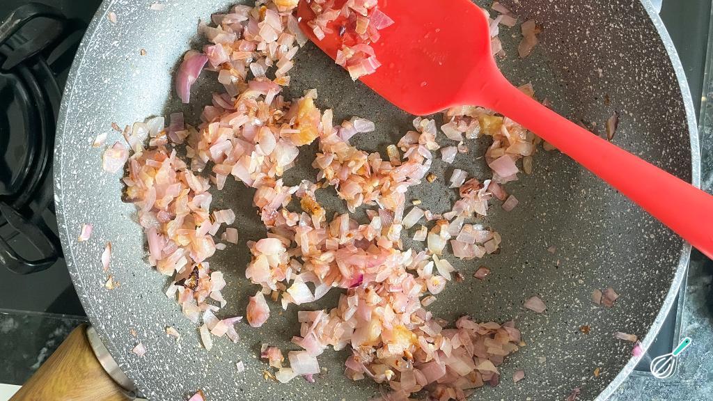 Refogue a cebola até dourar e depois adicione o alho, refogando rapidamente.