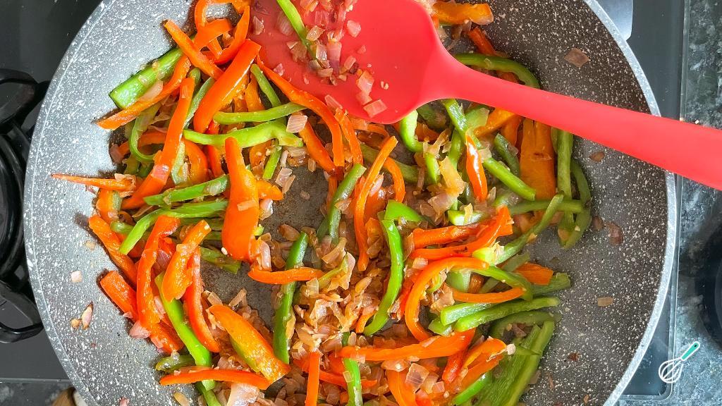 Adicione os pimentões em tiras na frigideira e refogue até que amoleçam.