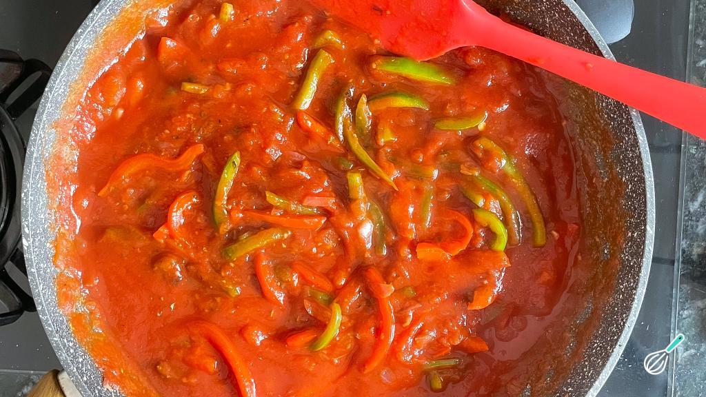Adicione o molho de tomate e tempere com sal, pimenta do reino, páprica picante e orégano. Deixe apurar por 3 minutos.