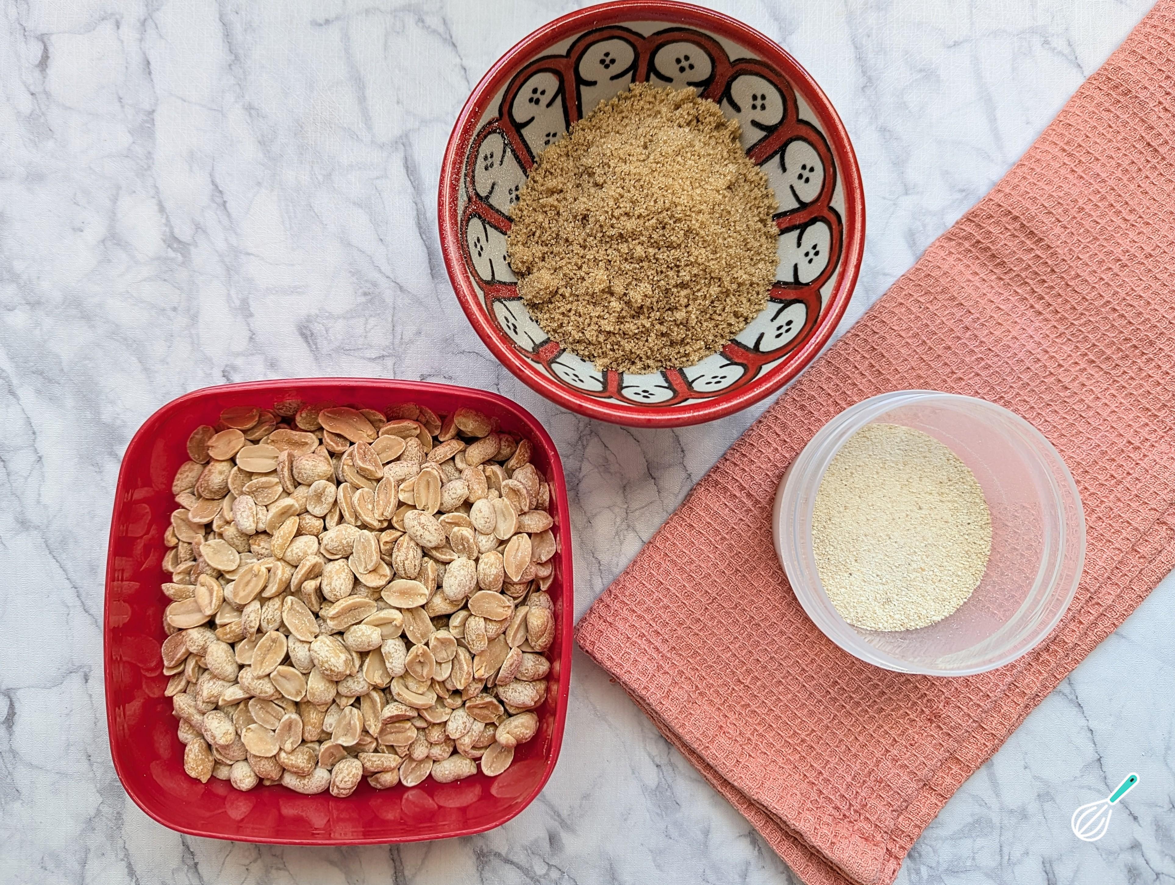 Comece separando todos os ingredientes que utilizaremos para preparar a paçoca caseira. Se o seu amendoim estiver cru, é necessário torrar antes de começar o preparo.