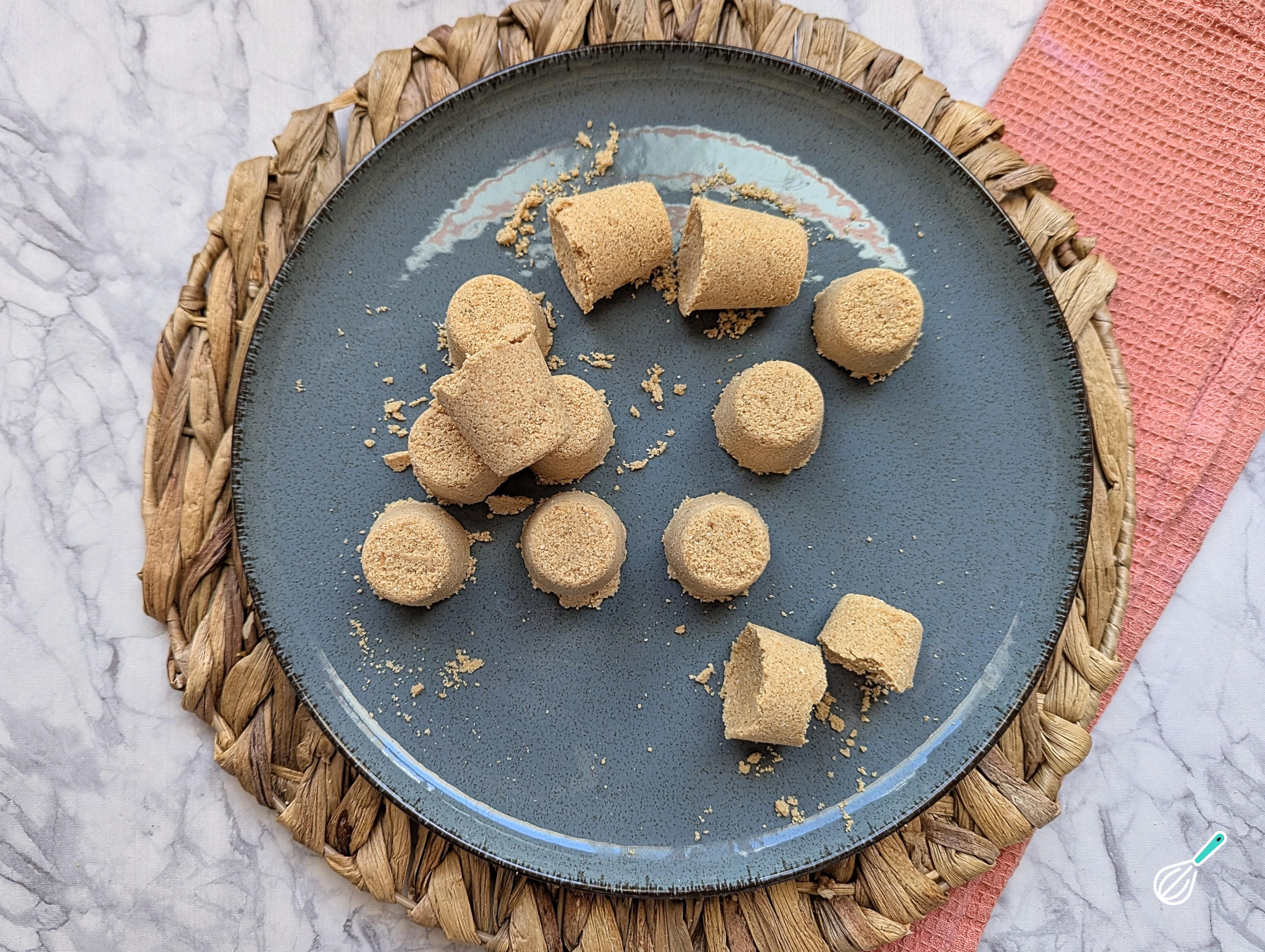 Modele porções da massa em formatos cilíndricos, usando um molde específico ou improvisando com pequenas forminhas. Pressione bem para que fiquem firmes. Caso deseje uma paçoca mais fina, você também pode moldar em quadrados ou formar de silicone.