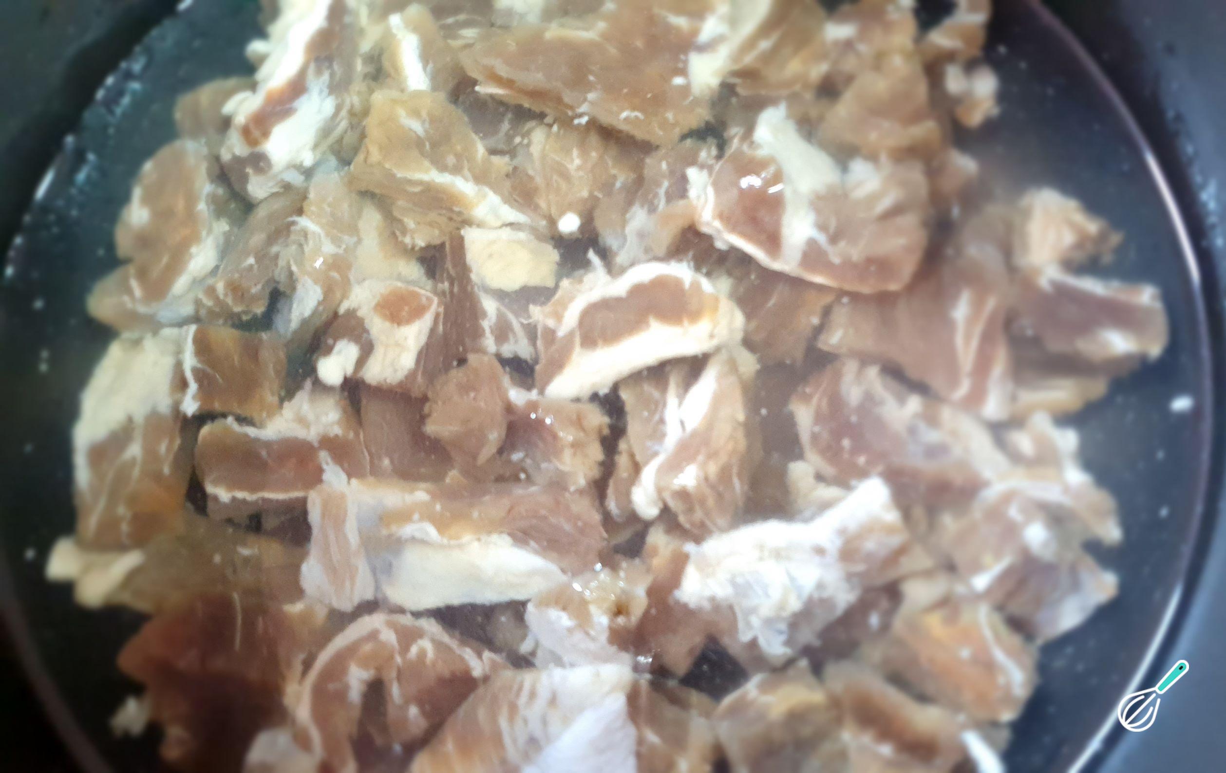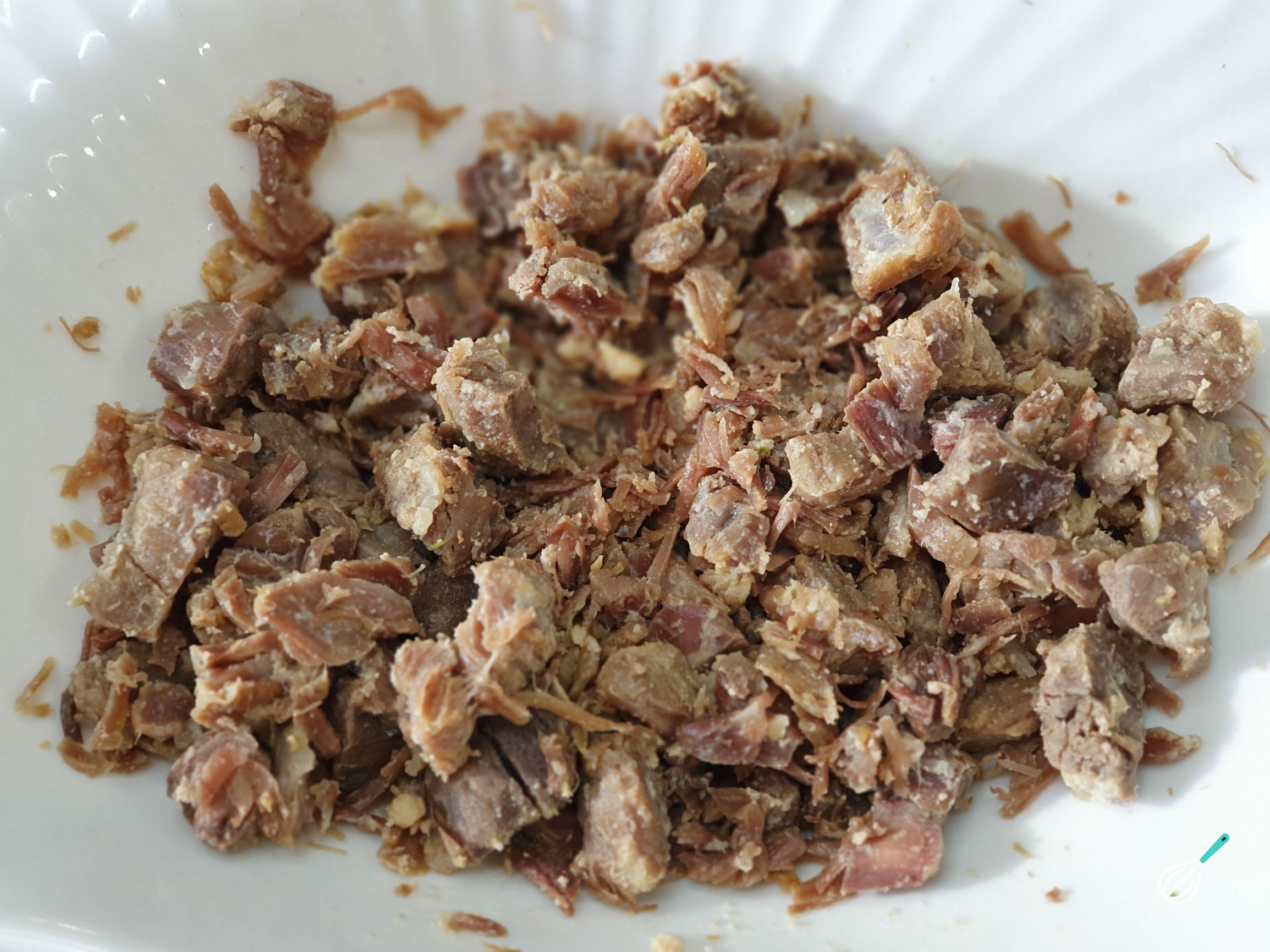 Depois de cozinhar a carne, é necessário remover todas as nervuras ou excesso de gordura que houver na carne.